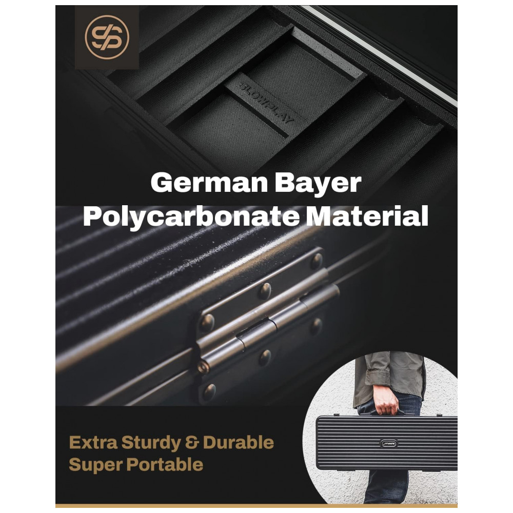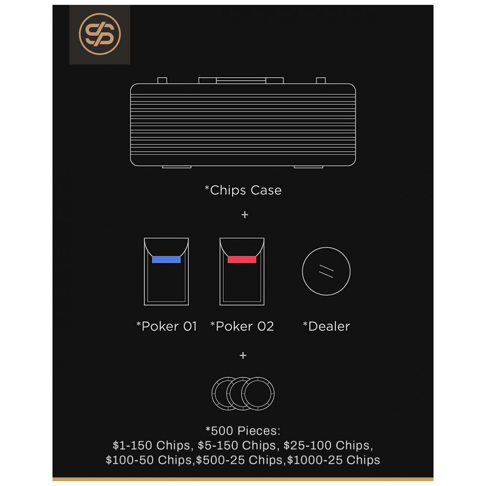 Carcaça externa é feita de material de policarbonato alemão Bayer, fabricado com moldagem por injeção de uma peça, tornando o extremamente durável. Também inclui uma estrutura de liga de alumínio personalizada, trava de liga de zinco e alça grande. Os chips feitos à mão apresentam suporte interno e materiais de embalagem de couro sintético. Super portátil com material preto de corpo inteiro.
