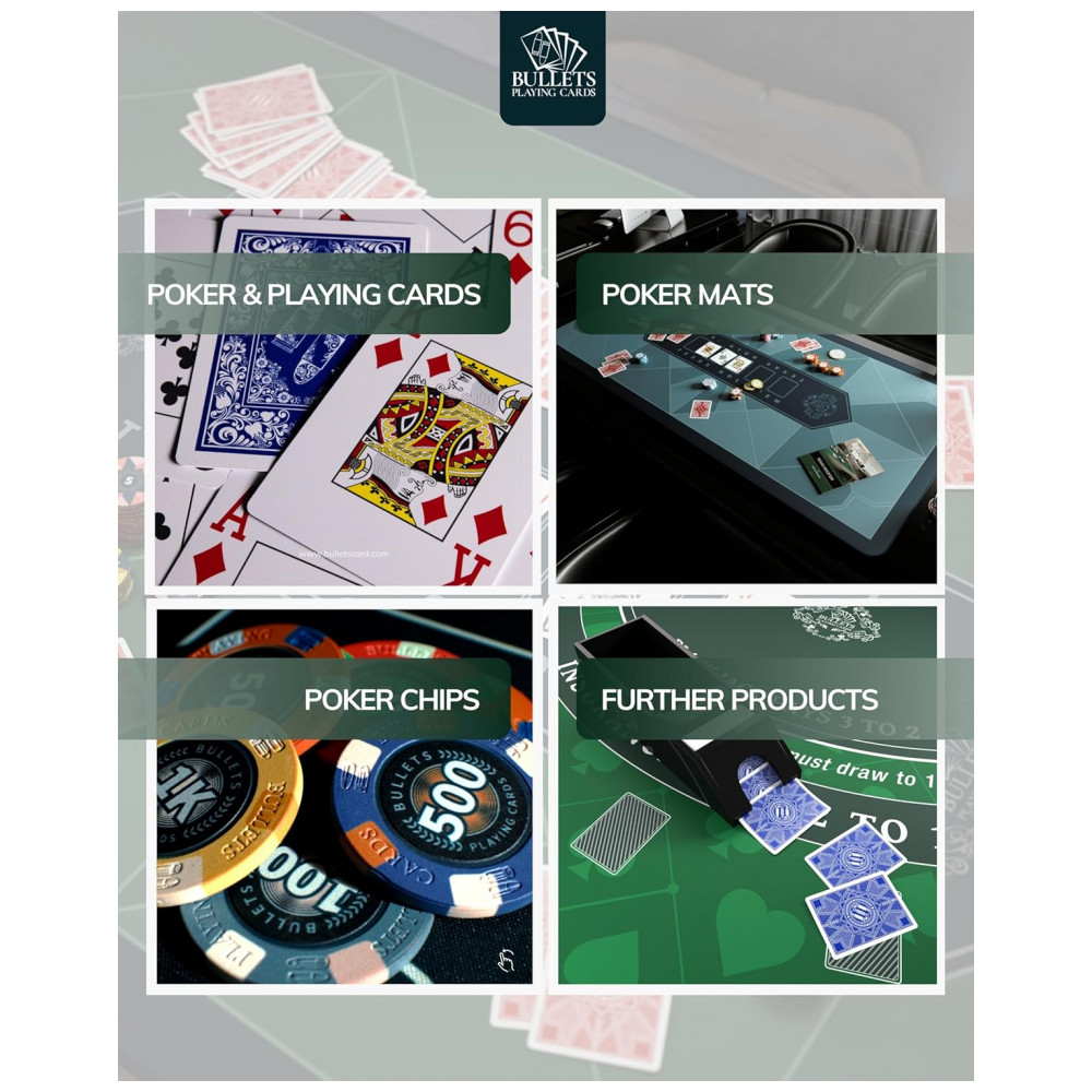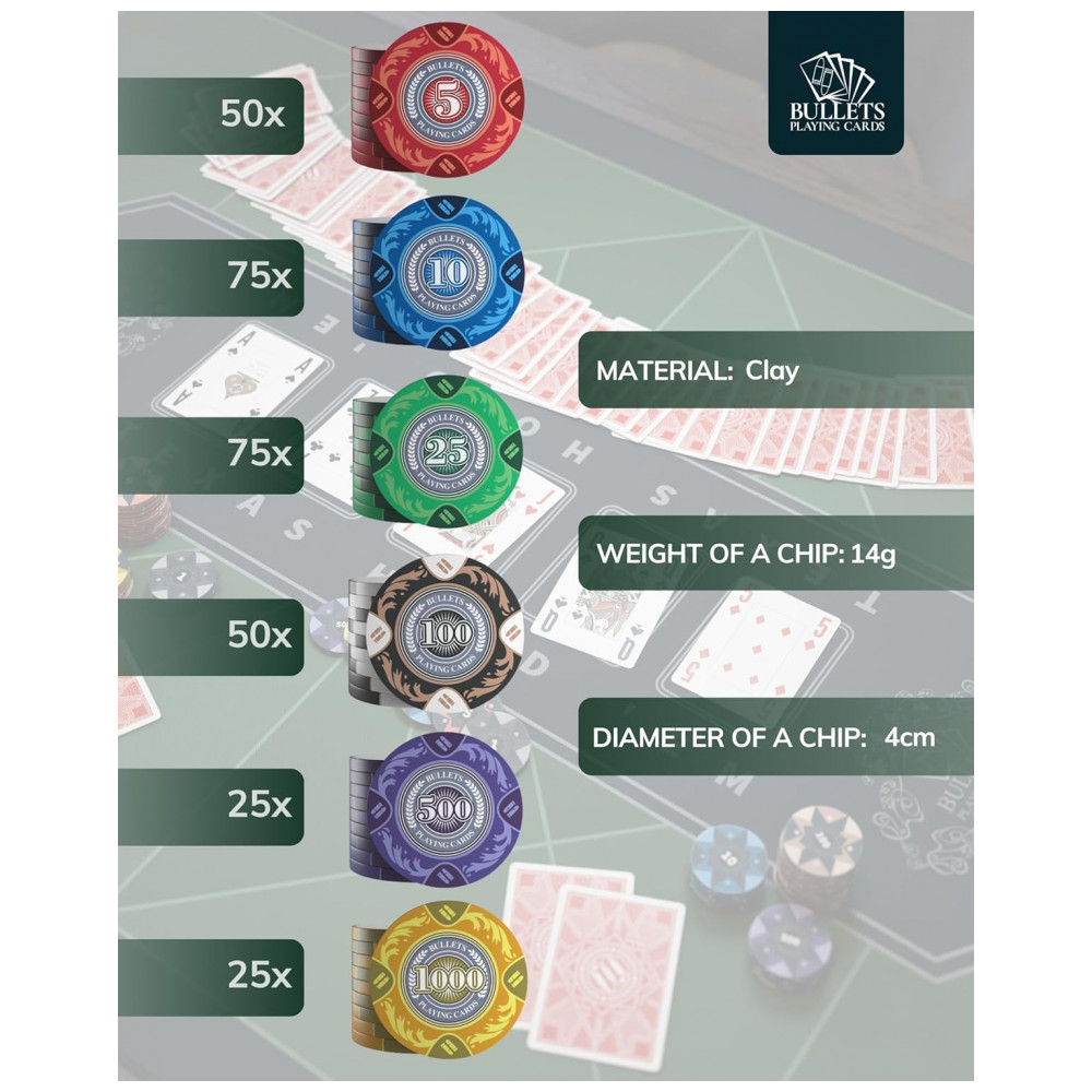 Inclui um botão de revendedor de cerâmica, 2 baralhos de cartas de pôquer de balas, 5 dados, regras de pôquer