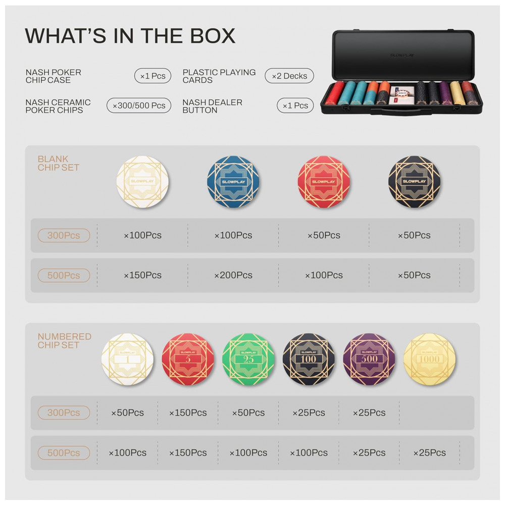 Eleve sua experiência de jogo. O conjunto de 300 fichas atende às necessidades de um jogo de 7 a 8 pessoas, e 500 fichas atendem facilmente às necessidades de 9 a 10 pessoas.