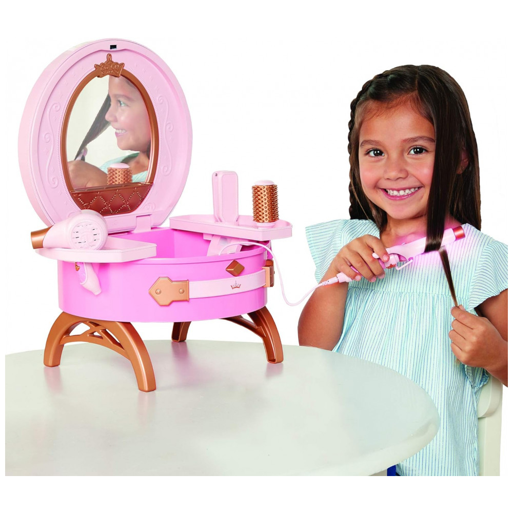 Inclui: 1 penteadeira, 1 chapinha de brincar, 1 chapinha de brincar, 1 secador de cabelo de brincar, 1 escova de ondulação, 1 pente de cabelo, 1 par de tesoura de brincar e 2 grampos de cabelo