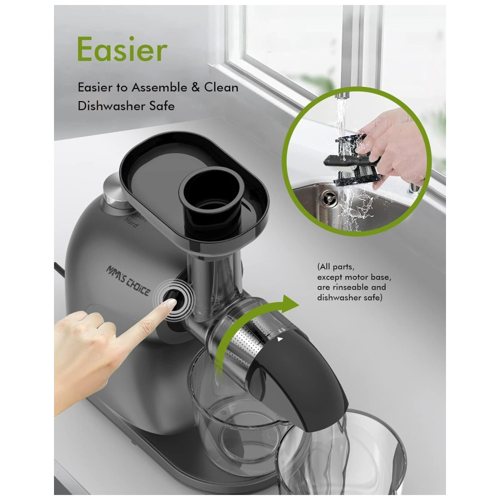 Fácil de limpar e desmontar O design de montagem de um botão permite desmontar os espremedores de mascar em poucos segundos. Pode ser colocado na máquina de lavar loiça para limpar, tem função reversa para evitar encravamentos e está equipado com uma escova de limpeza especial para tornar a limpeza do espremedor mais cómoda. Também preparou para você um livro de receitas super grande copo de suco 650ML e copo de polpa 1000ML