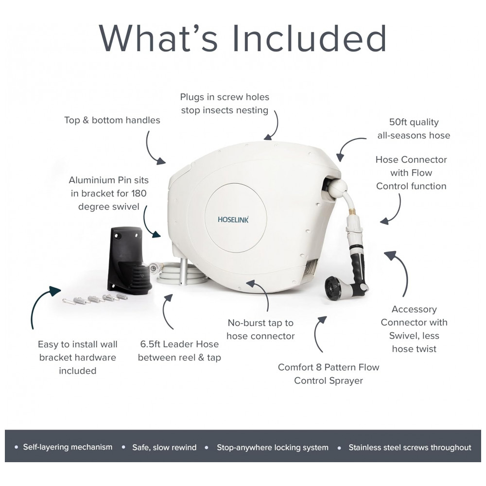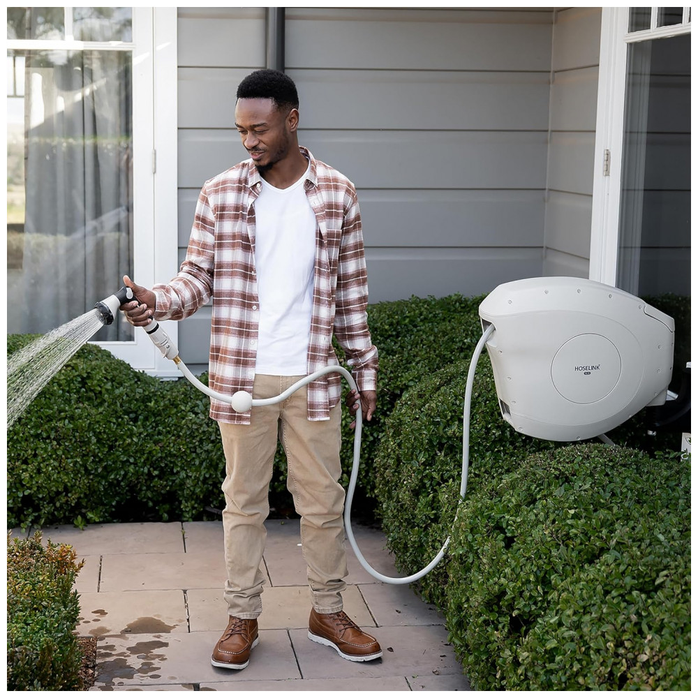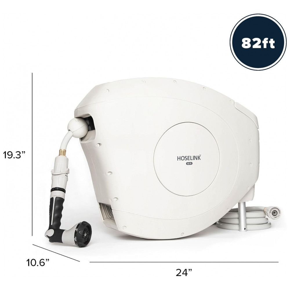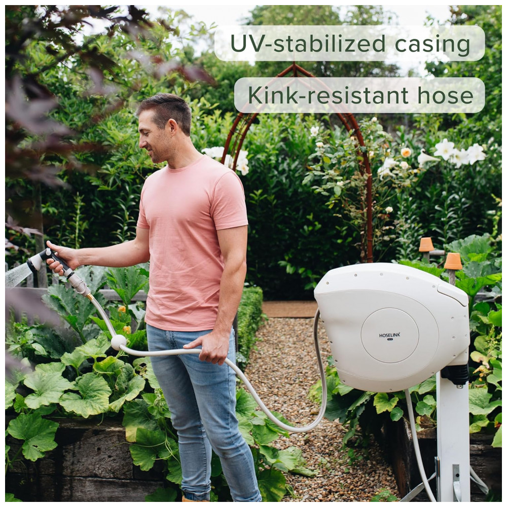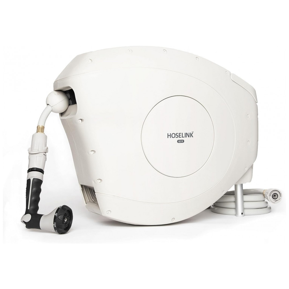 EFICIENTE E FÁCIL DE USAR O carretel retrátil de mangueira de jardim Hoselink vem equipado com uma mangueira à prova de torções de 25 metros. Estenda apenas o comprimento da mangueira que você precisa e o mecanismo de travamento pare em qualquer lugar irá mantê la no lugar para regar facilmente em seu quintal.