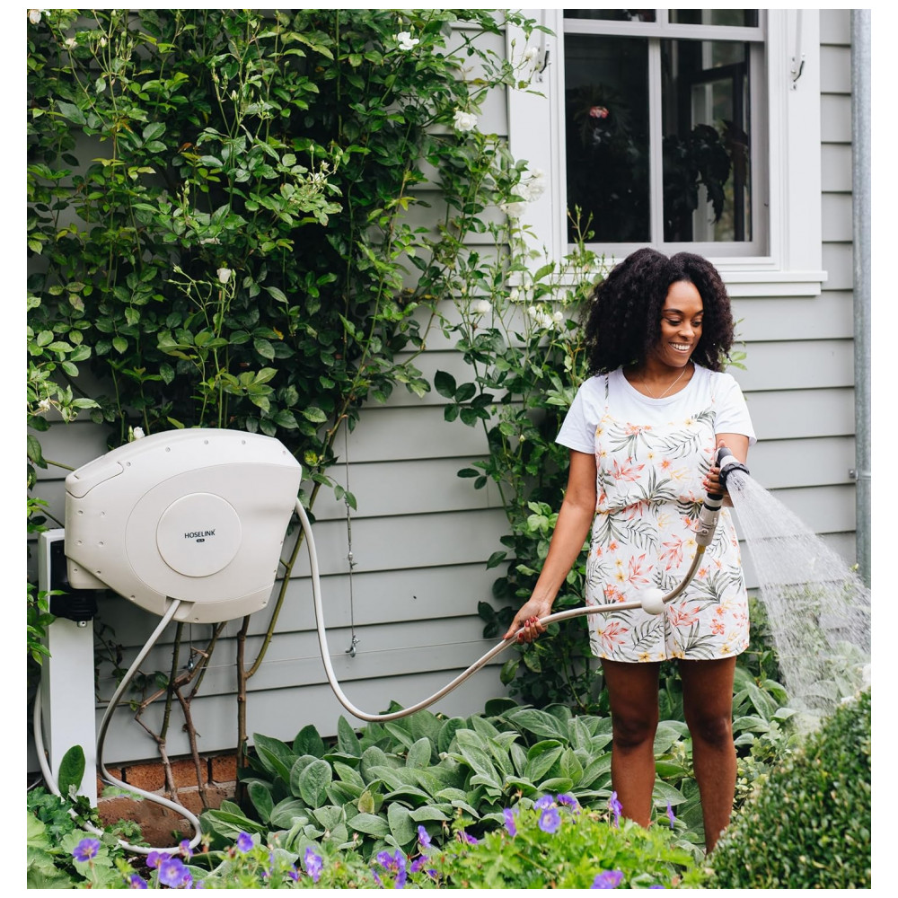LIMPO, ESTILO E Chega de mangueiras feias espalhadas como perigo de tropeço, o carretel de mangueira retrátil Hoselink combina com sua casa ou jardim e mantém uma estética elegante.