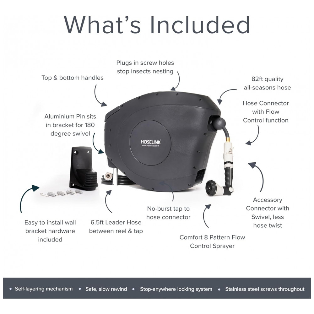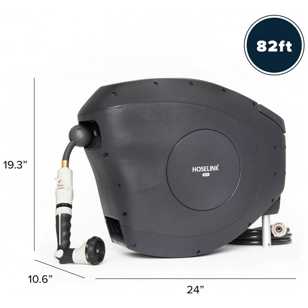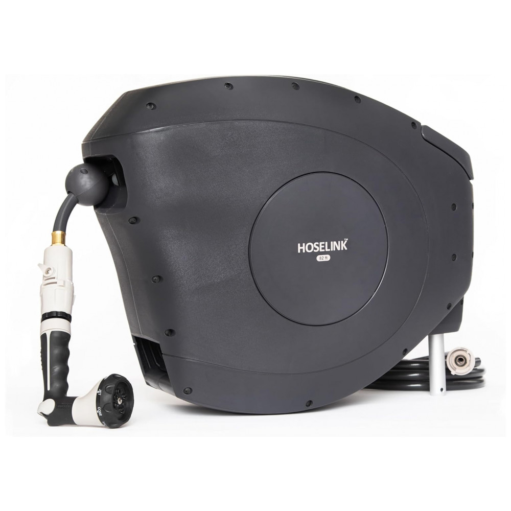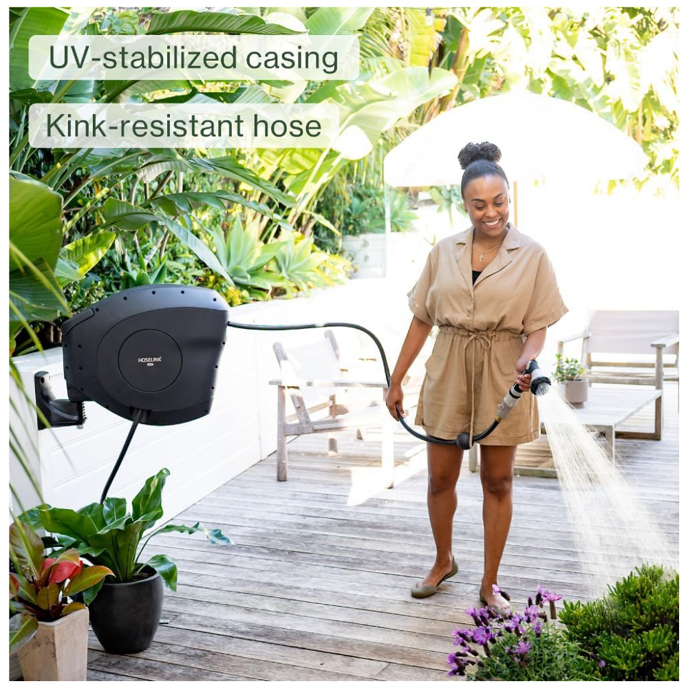 EFICIENTE E FÁCIL DE USAR O carretel retrátil de mangueira de jardim Hoselink vem equipado com uma mangueira à prova de torções de 25 metros. Estenda apenas o comprimento da mangueira que você precisa e o mecanismo de travamento pare em qualquer lugar irá mantê la no lugar para regar facilmente em seu quintal.