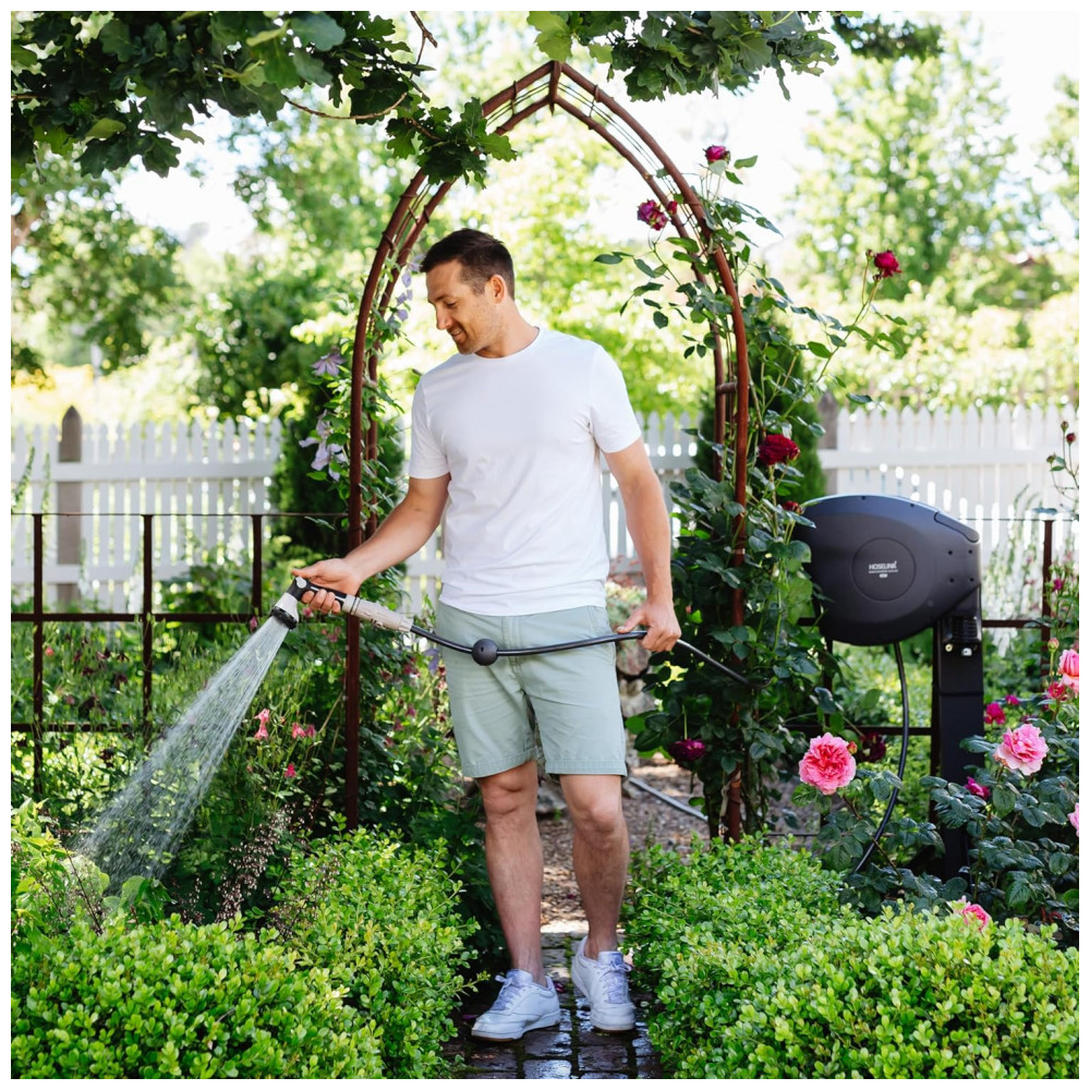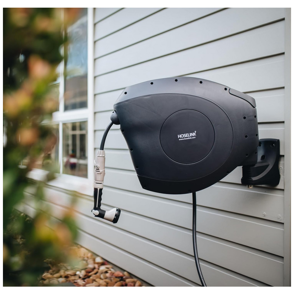 LIMPO, ESTILO E Chega de mangueiras feias espalhadas como perigo de tropeço, o carretel de mangueira retrátil Hoselink combina com sua casa ou jardim e mantém uma estética elegante.