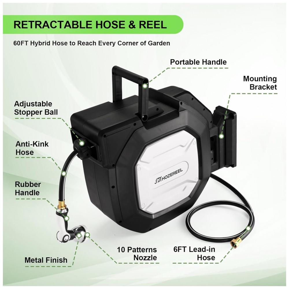 Resistente para uso a longo prazo: O carretel de mangueira HOZEREEL é bem construído e não vaza no uso diário normal. A mangueira híbrida tem uma construção reforçada e os acessórios de conexão são feitos de latão.