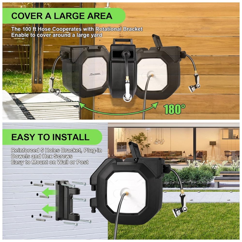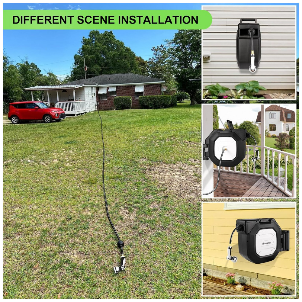 Torna a rega mais fácil: Cansado de se abaixar e enrolar a mangueira tradicional Compre este carretel de mangueira Torna muito mais fácil qualquer coisa que envolva uma mangueira O sistema de auto rebobinamento permite lhe desfrutar da rega do jardim. Este carretel de mangueira retrátil pode enrolar e rebobinar facilmente com apenas um leve puxão para economizar esforço e tempo.