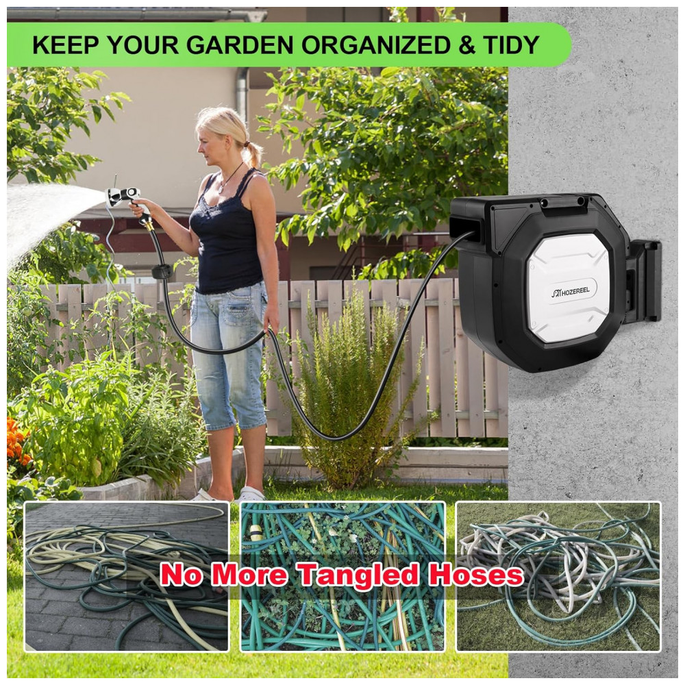 Mangueira de Jadim 40M com Enrolador Retrátil Rebobinamento Automático e Trava HOZEREEL Preto e Branco