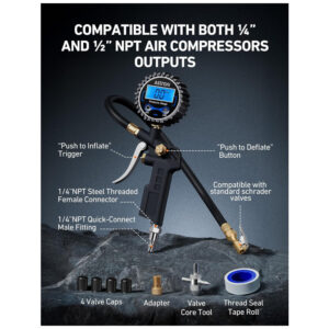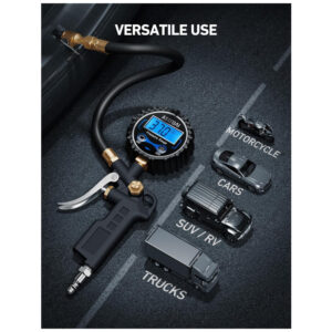 O Manômetro Digital AstroAI com Inflador é compatível com saídas de compressores de ar NPT e tanto Válvulas Schrader padrão. Calibrado profissionalmente para fornecer sempre leituras precisas, com margem de erro de apenas 1 em relação à pressão exata do seu pneu. Essencial para segurança, pneus adequadamente inflados garantem melhor desempenho em todas as condições climáticas, reduzem a probabilidade de furos, explosões e acidentes. Além disso, aumentam a eficiência de combustível, economizam dinheiro com desgaste de pneus e tornam a direção mais segura. Este versátil manômetro inclui um engate reto, mangueira, válvula de sangria e função de de inflação e desinflação, tudo em uma única unidade. Construído com aço inoxidável resistente e componentes de latão de alta qualidade, oferece durabilidade e desempenho duradouros. Funciona automaticamente ao detectar ar pressurizado e desliga após 20 segundos de inatividade.