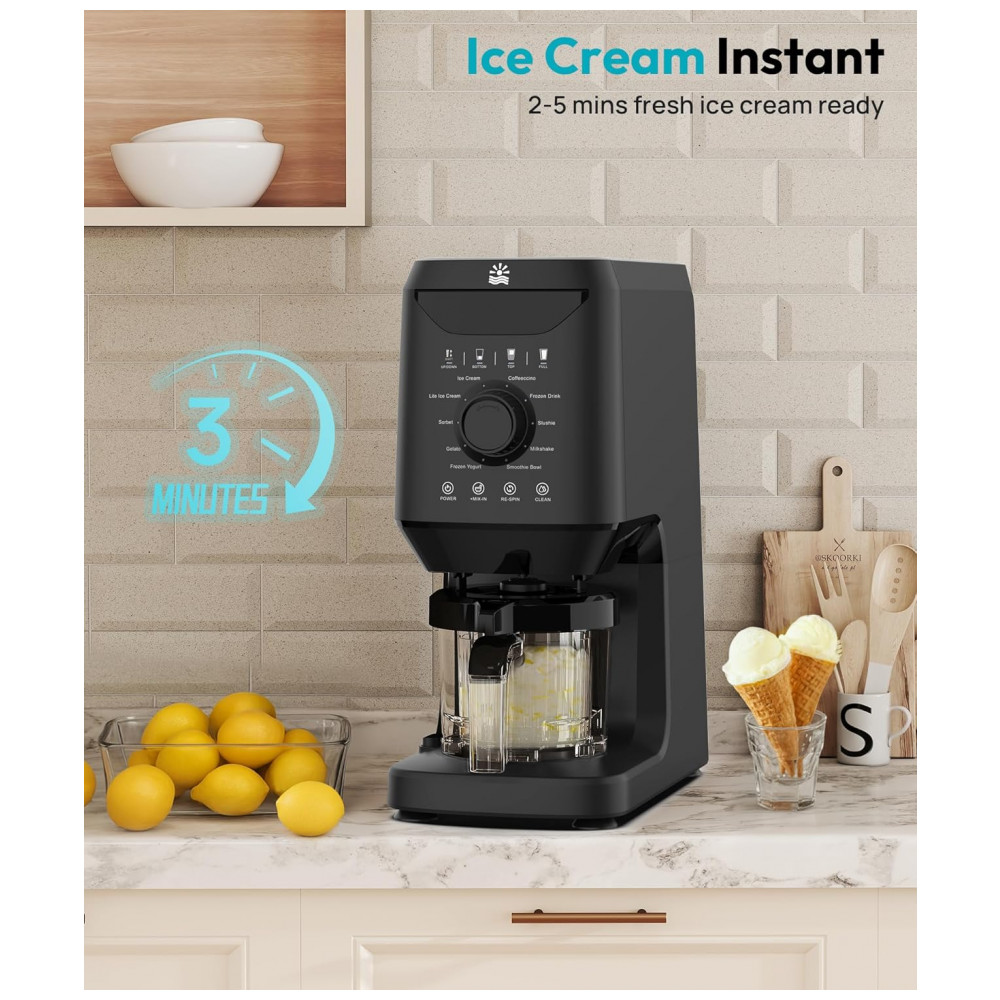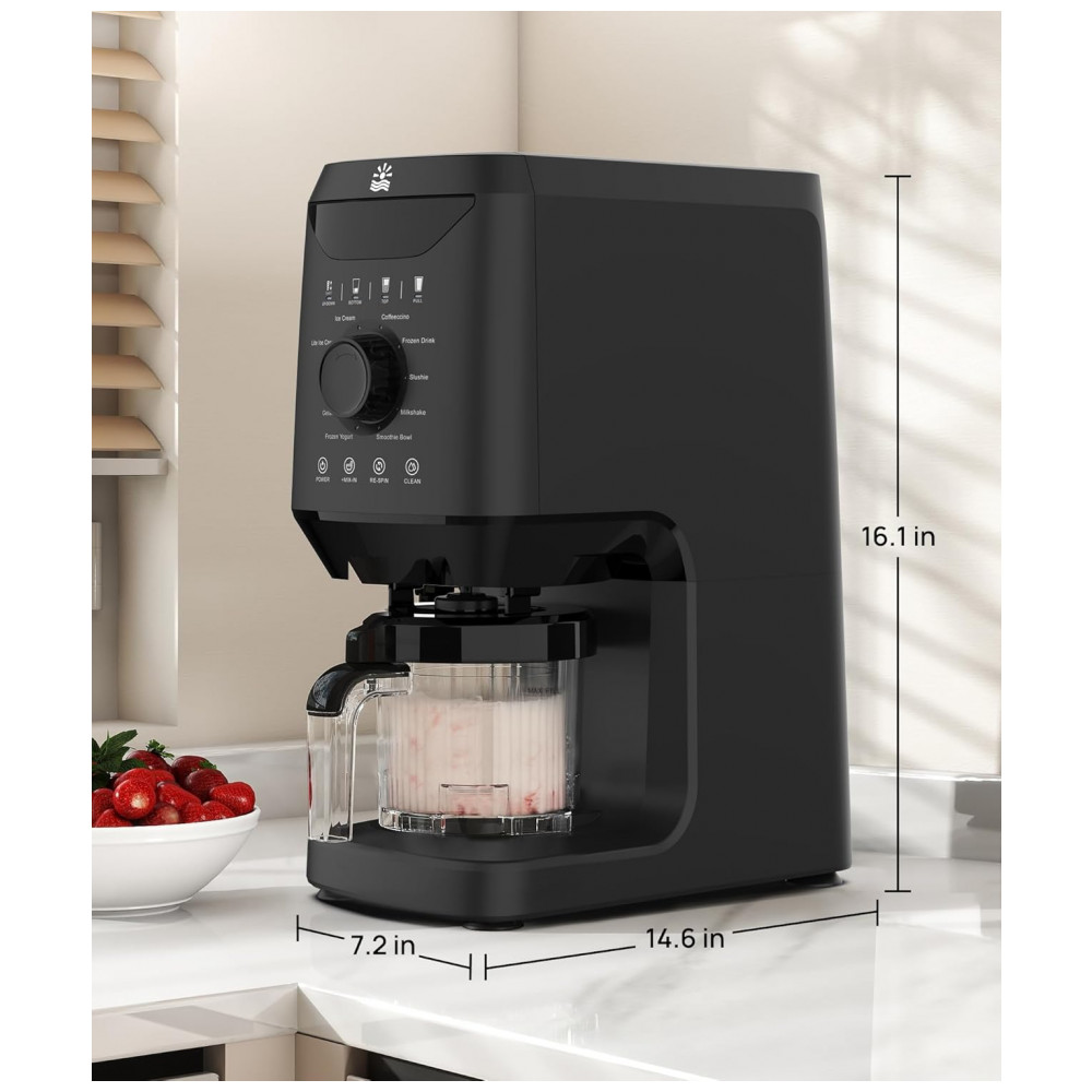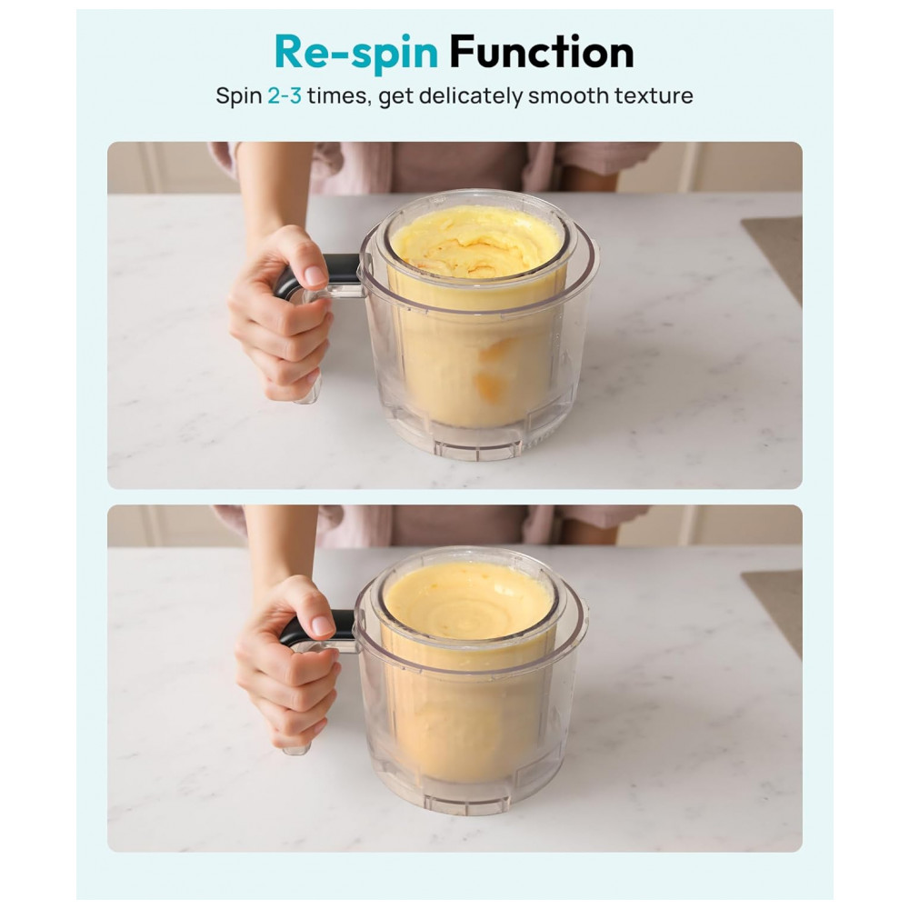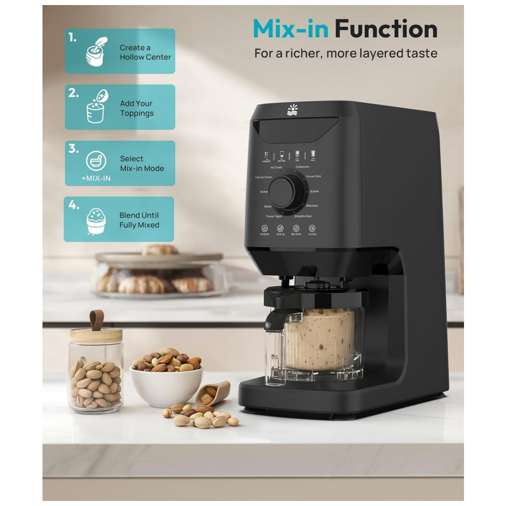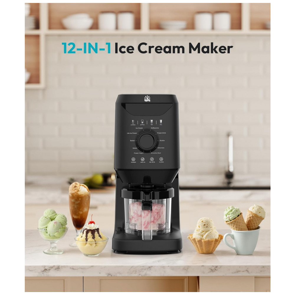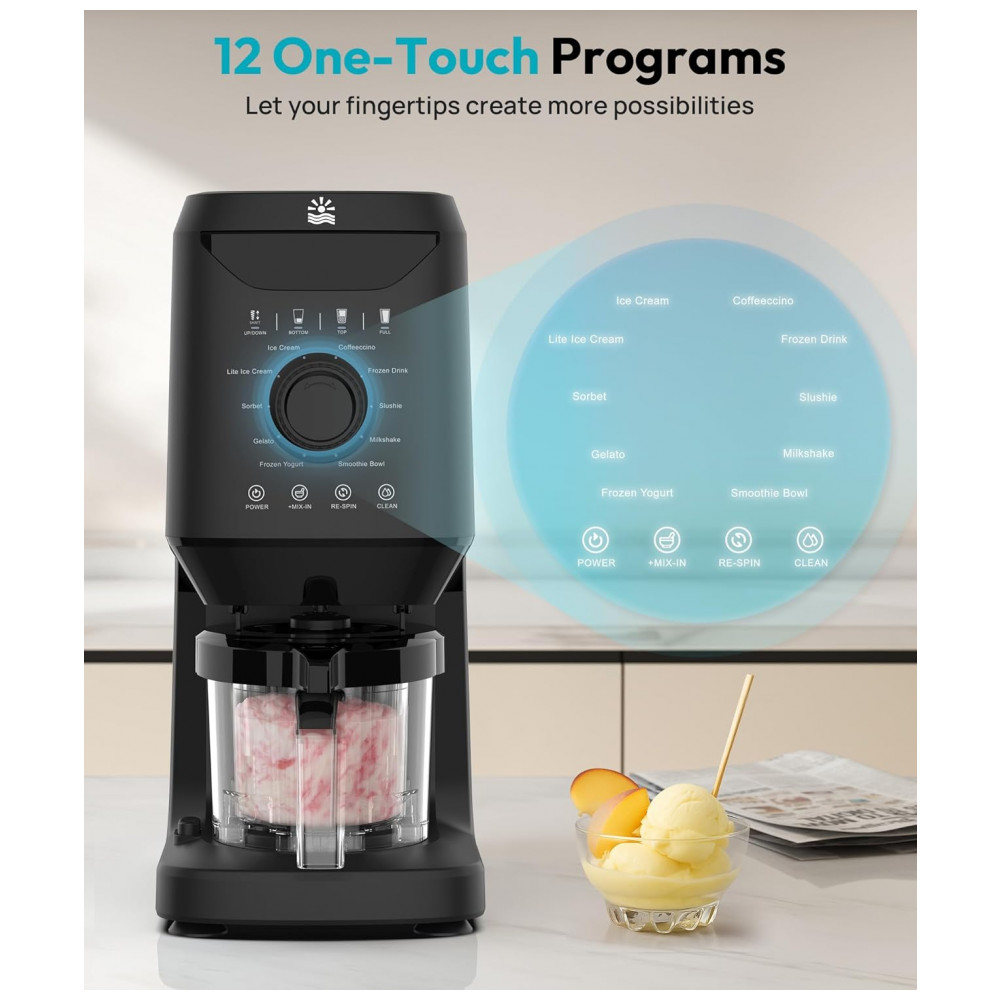 A Rellytech 12-em-1 é uma máquina automática de sobremesas congeladas com 12 programas de toque único para sorvete, gelato, sorbet, milkshake e mais, processando em 2-5 minutos. Inclui função Mix-in para incorporação de aditivos como nozes ou frutas, e tecnologia Re-spin que garante textura lisa sem cristais de gelo. Design compacto em plástico preto, com dois recipientes de 473 ml e tampas para preparos contínuos.
