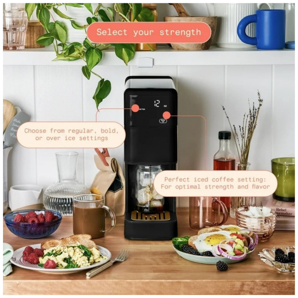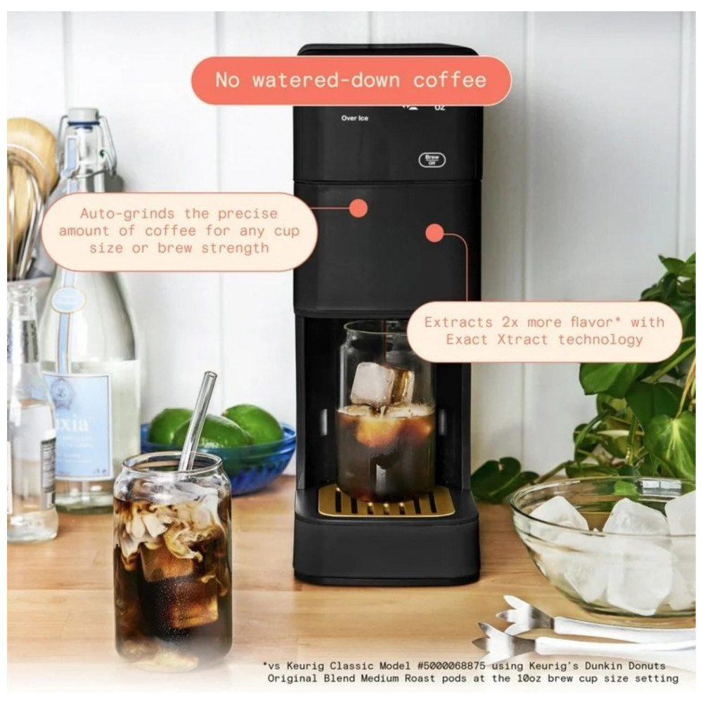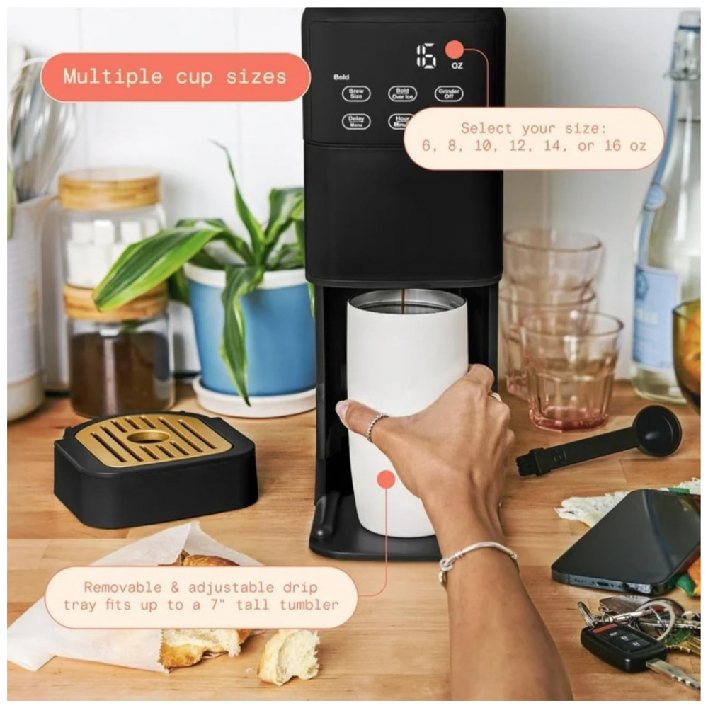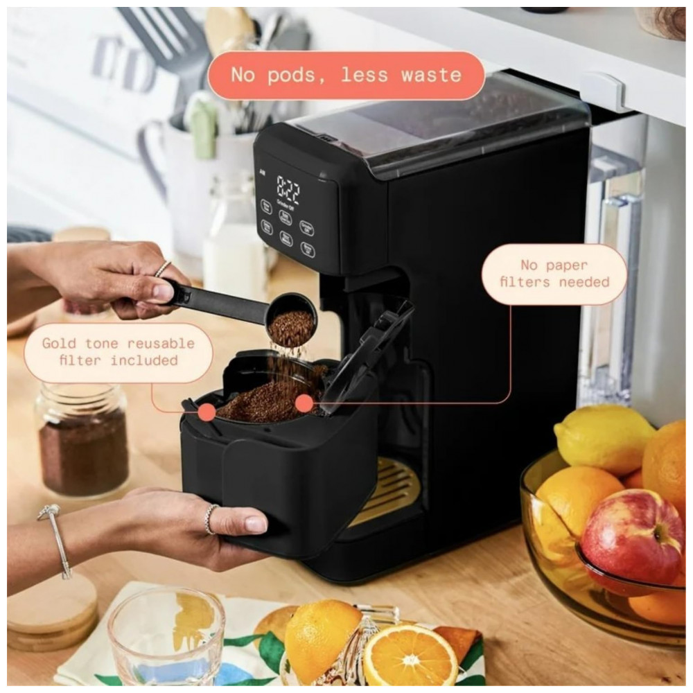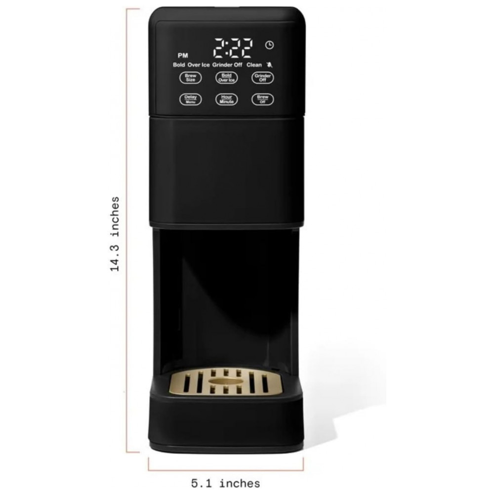 A cafeteira single serve programável Generic com moedor de bure integrado em preto gergelim prepara café moendo grãos inteiros para infusão fresca. Indicada para uso doméstico, oferece configurações de força (regular, forte ou over ice) via display touch com timer para preparo automático. Reservatório removível de 1,9 L permite múltiplas infusões sem recarga frequente.
