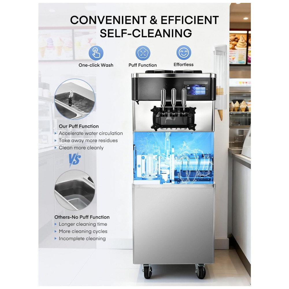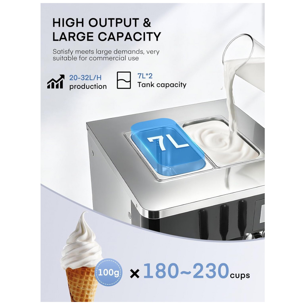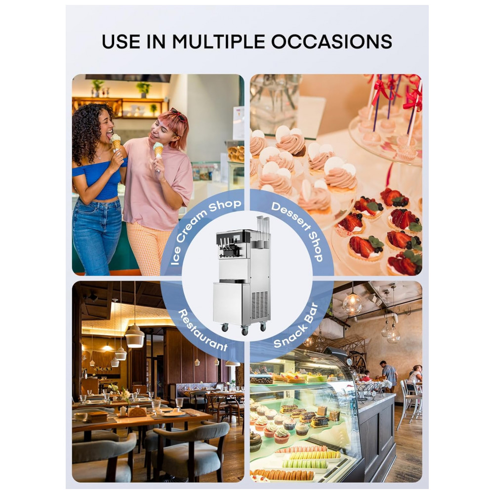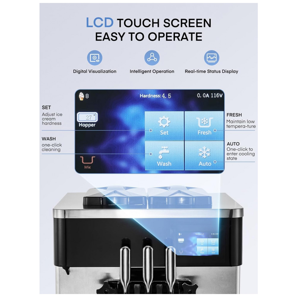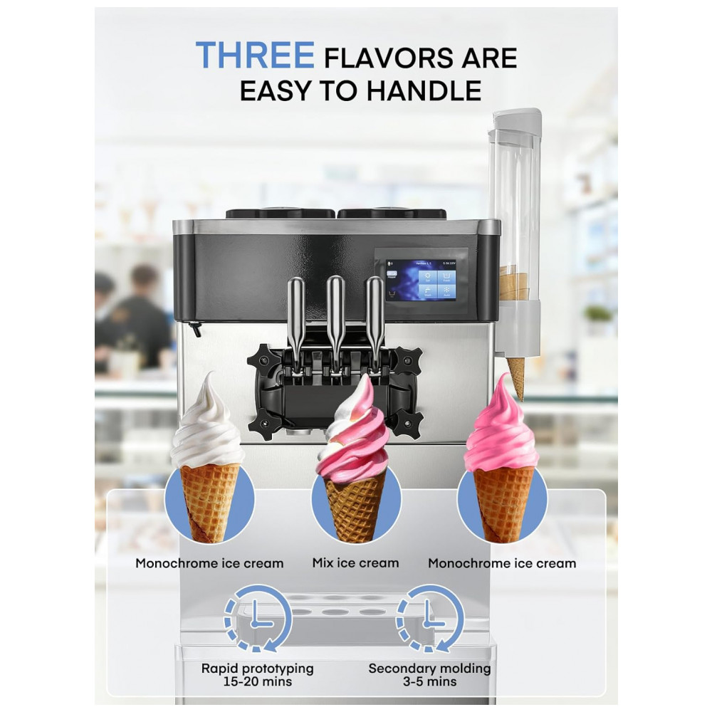Máquina Comercial de Sorvete FOHERE 3 Sabores 25-32 L/h Prata Funil 14 L Painel LCD Touch Auto Limpeza 825B 2200W
