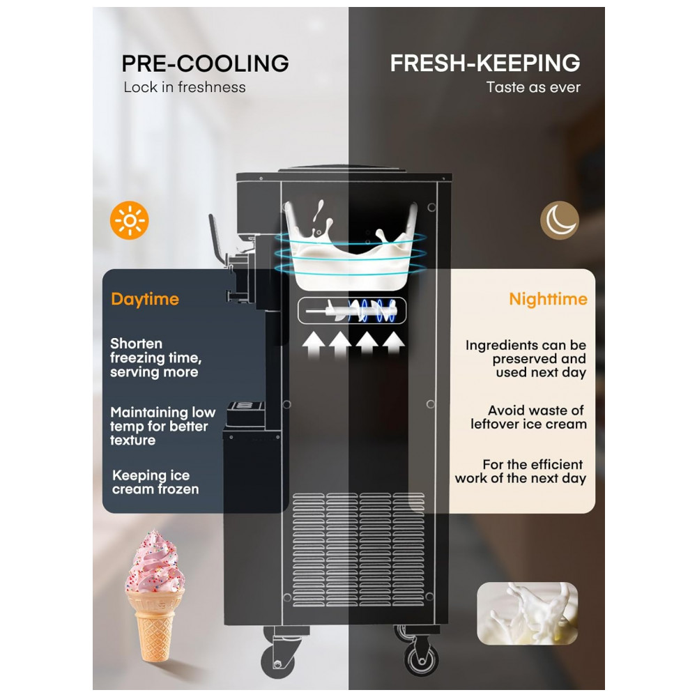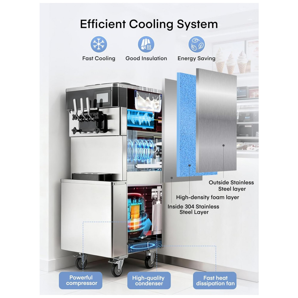 A FOHERE 825B é uma máquina comercial de sorvete soft serve com compressor de alta eficiência, refrigeração rápida em 25 minutos iniciais e ciclos subsequentes em 6 minutos, produzindo 25-32 litros por hora em temperaturas ambientes de 5 a 35°C. Equipada com dois funis de 7 L e três dispensadores para 2 sabores puros + 1 misto, incorpora tecnologia de puffing profundo para textura cremosa e visual expandido, otimizando uso de matérias-primas. Painel LCD touch controla tamanho de porção, dureza, temperatura, pré-resfriamento, preservação de frescor e programa de autolimpeza com temporizador.