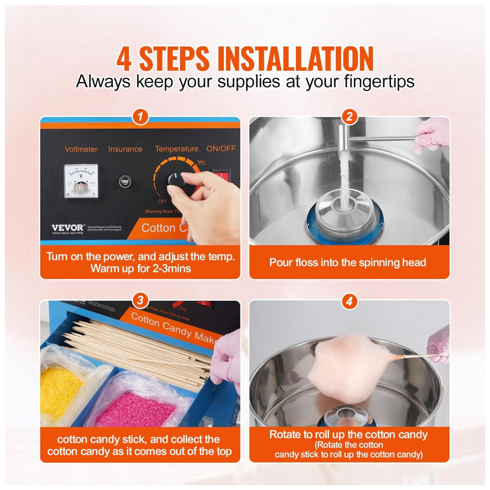 FÁCIL DE USAR E LIMPAR Ligue o motor e aqueça por 2 minutos. E ligue o booster deixe esquentar por volta de 4 minutos Aí você pode começar a fazer algodão doce Basta colocar fio dental na tampa de açúcar e você terá seu próprio algodão doce O design inovador apresenta montagem e desmontagem simples, tornando a configuração fácil e a limpeza super rápida, para que você possa se deliciar com uma guloseima saborosa sempre que quiser, sem ter que perder tempo indesejado limpando