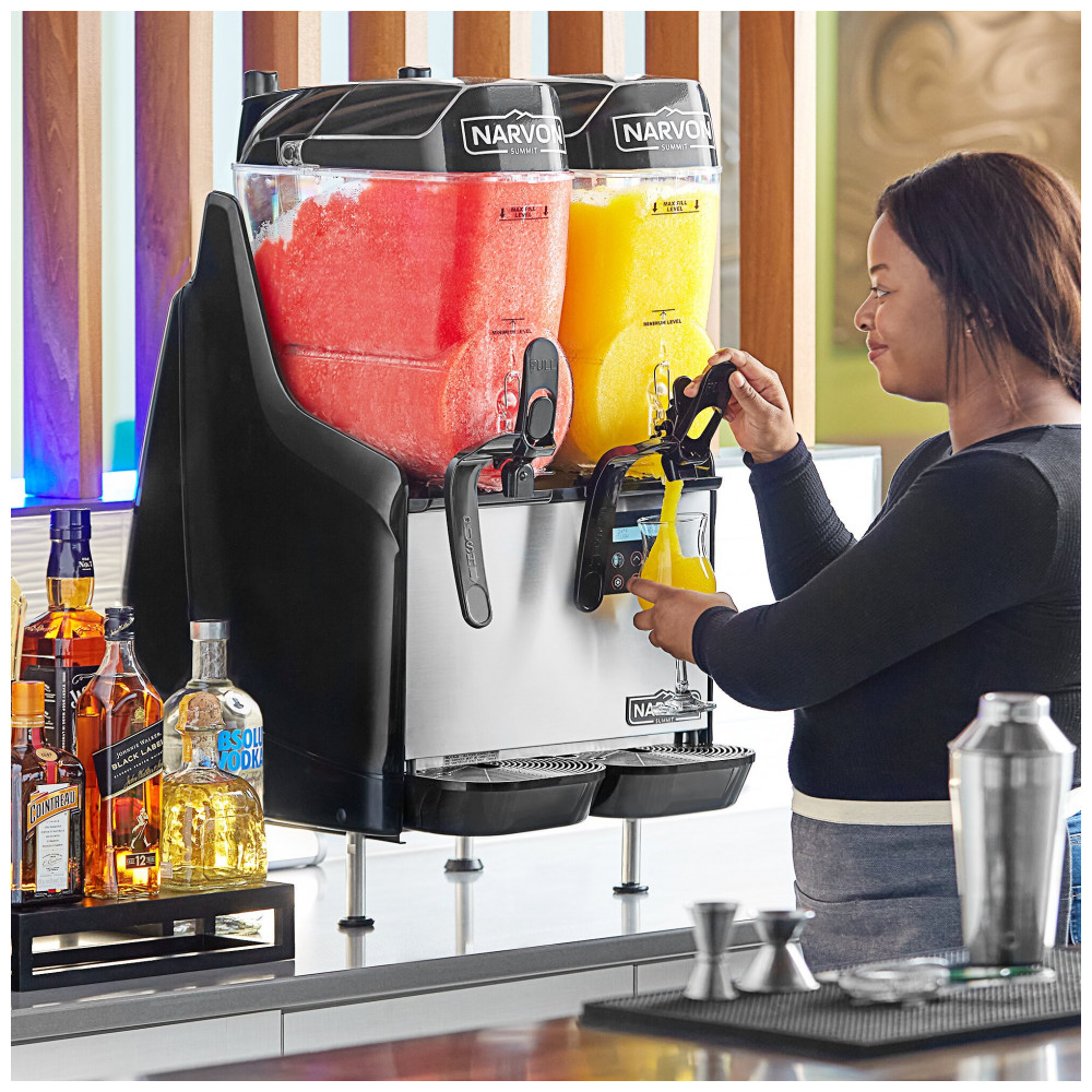 Com a Máquina de Bebidas Congeladas Narvon Summit Double, você terá ainda mais facilidade e eficiência na preparação de bebidas geladas. Suas tampas articuladas facilitam o uso e o enchimento, enquanto os controles digitais permitem uma programação simples. O sistema de resfriamento especializado e descongelamento rápido tornam a preparação e limpeza convenientes. Com fluxo de ar vertical, a máquina pode ser instalada ao lado de outros equipamentos. A trava da torneira e a tigela removível são fáceis de limpar. Ideal para slushies, granitas e até mesmo bebidas alcoólicas, esse versátil dispensador maximiza as vendas de bebidas em qualquer estabelecimento. A máquina se destaca por sua versatilidade e eficiência, podendo ser utilizada com misturas alcoólicas, perfeita para bares. Além disso, é compacta e não requer espaço de folga, cabendo em qualquer balcão. Com manutenção simplificada e desmontagem fácil, o processo de limpeza é rápido e prático. Garanta a operação em condições ideais adquirindo os kits de manutenção recomendados. Monitore a temperatura de cada recipiente facilmente para manter a consistência ideal. A máquina é programável e possui modo automático, reduzindo o tempo de preparo e permitindo controle total. Promovendo excelente visibilidade dos produtos, as duas bacias de 12 litros permitem que suas bebidas coloridas se destaquem, aumentando as vendas por impulso. As luzes atrás das bacias elevam a apresentação dos produtos, destacando-os em ambientes pouco iluminados. Versátil, podendo ser usada em ambientes internos ou externos, a máquina funciona em até 43°C e oferece cinco idiomas de configuração. Aproveite o Calculador de Custo de Slushy e descubra o potencial de lucro por ano. Surpreenda-se com a possibilidade de obter até 80% de lucro bruto por porção!