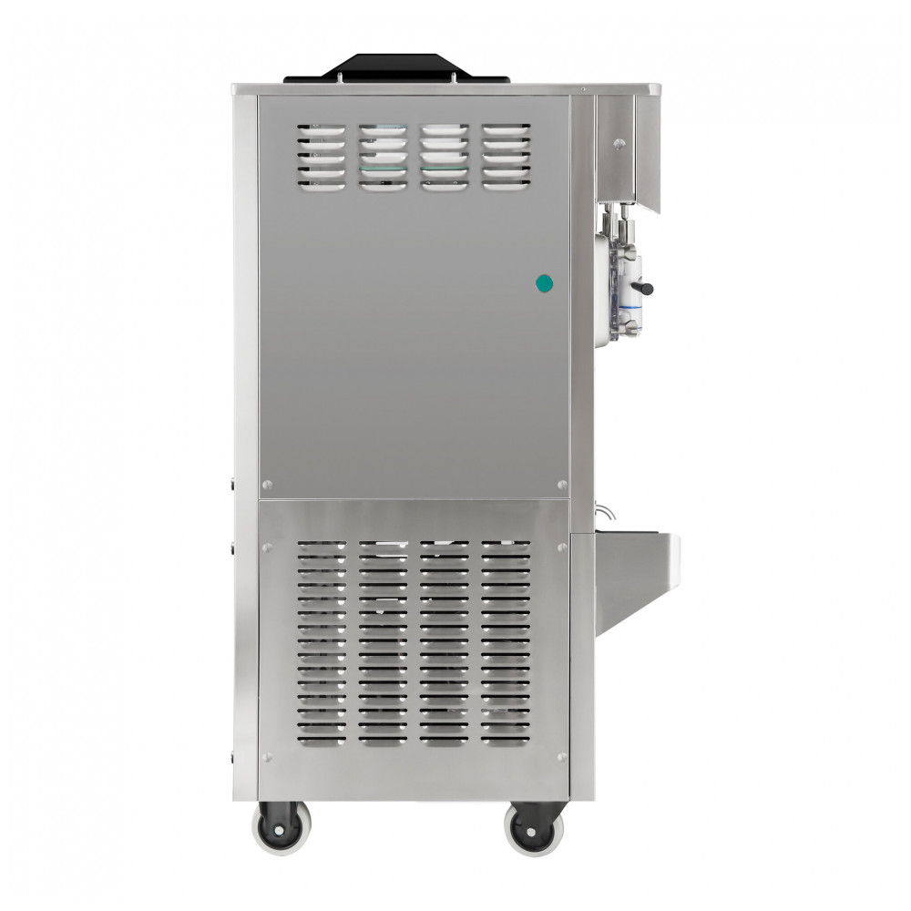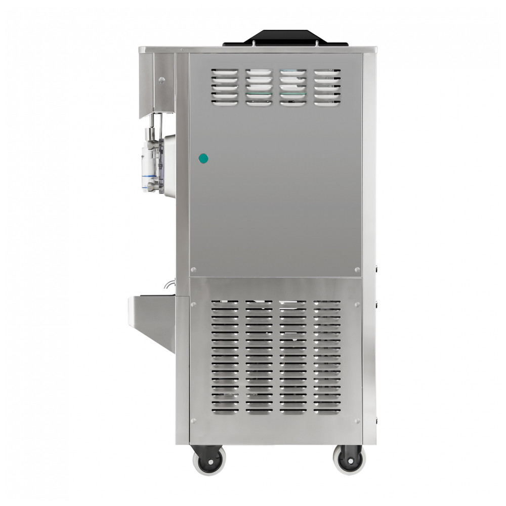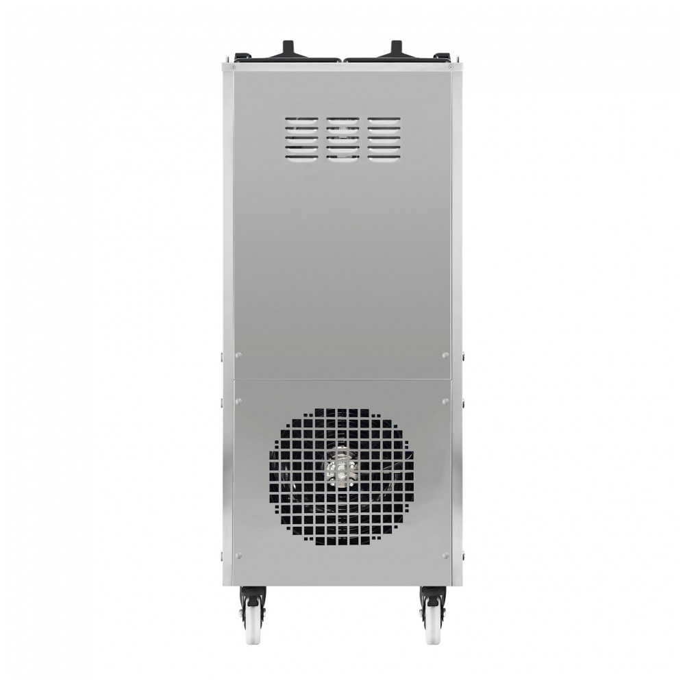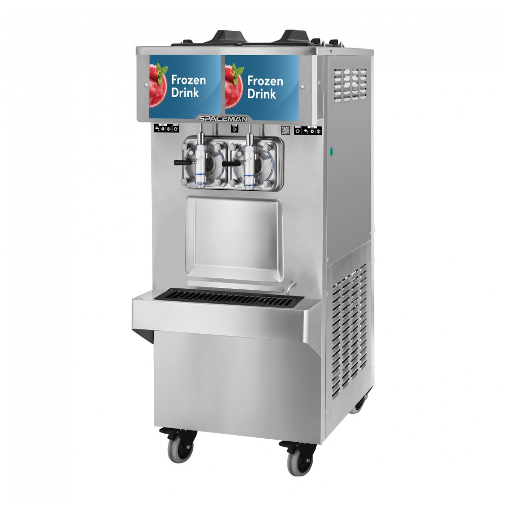 Produza até 480 bebidas de 300 ml por hora com a Máquina de Bebidas Congeladas Spaceman 6795C. Equipada com controle automático de viscosidade, luz indicadora de mistura baixa, prevenção de superaquecimento, agitador de reservatório padrão e controle de viscosidade ajustável, essa máquina é perfeita para produzir slushies e coquetéis congelados. Com capacidade para 2 sabores diferentes, produz até 150 litros por hora. Possui cilindros de congelamento de 7.3 litros e reservatórios de mistura de 20 litros, podendo ser usada com produtos lácteos e não lácteos. O controle totalmente ajustável de viscosidade permite definir a espessura desejada para cada produto, garantindo qualidade e consistência. O design do agitador do reservatório garante qualidade consistente. Com sinais luminosos de adição de mistura e mistura esgotada, é fácil de manter o controle dos níveis de produto. A máquina desliga automaticamente em caso de temperaturas baixas ou sobrecarga do motor, além de contar com um interruptor de alta pressão. Requer uma conexão elétrica de 208-230V, cabo e plugue incluso. Equipada com rodízios para facilitar a movimentação. Com dimensões de 63,5 x 81,3 x 157,5 cm (L x P x A) e peso de 260 kg.