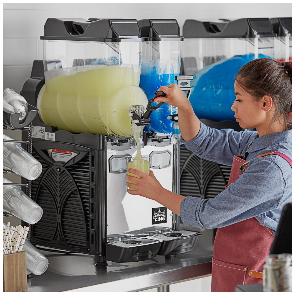 Apresentando controle ajustável de espessura, esta máquina de bebidas geladas da Carnival King conta com dois recipientes que podem misturar várias bebidas congeladas ao mesmo tempo. Com chassi durável de aço inoxidável e bandeja removível para uma limpeza fácil, é ideal para ambientes de baixo uso. Perfeito para smoothies, slushies e granitas, este dispensador duplo vai aumentar suas vendas de bebidas ao exibir as bebidas refrescantes dentro dele, despertando a sede dos clientes. Mantenha seus clientes felizes e hidratados com todas as suas deliciosas misturas congeladas dispensadas de forma fácil e eficiente. As tigelas transparentes de 9,8 litros proporcionam alta visibilidade para atrair os clientes a experimentar suas bebidas. Inclui controle de espessura do slush na parte de trás do dispositivo para a consistência perfeita a cada ocasião.