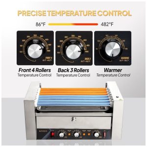 Os controles de temperatura dupla permitem ajustar a temperatura de cozimento para os rolos dianteiros e traseiros, com uma faixa de operação entre 30°C e 250°C (86°F a 482°F) e uma faixa de temperatura para o aquecedor de pães entre 30°C e 85°C (86°F a 185°F). A rotação lenta dos rolos assegura que os cachorros-quentes sejam cozidos uniformemente, mantendo o sabor suculento.