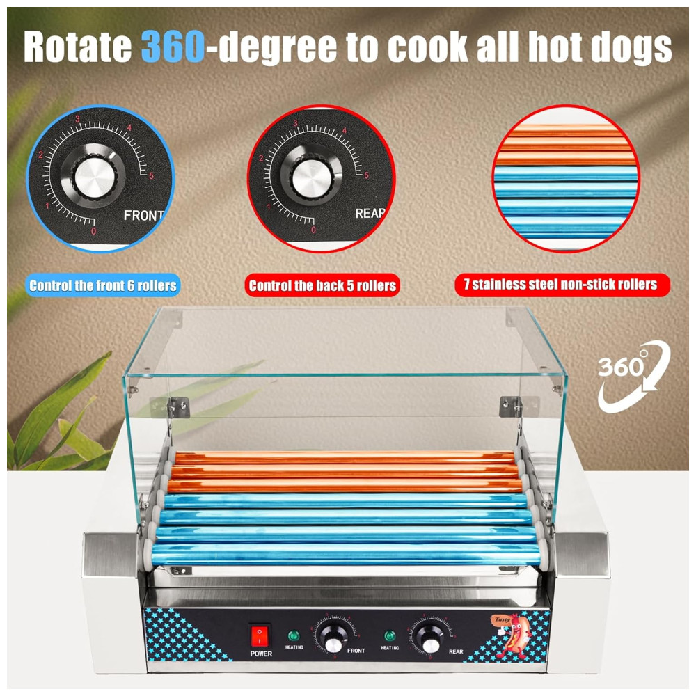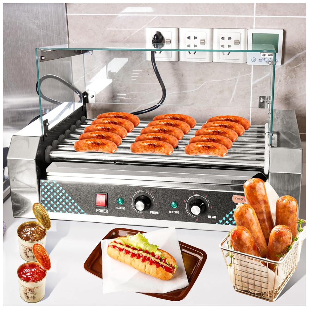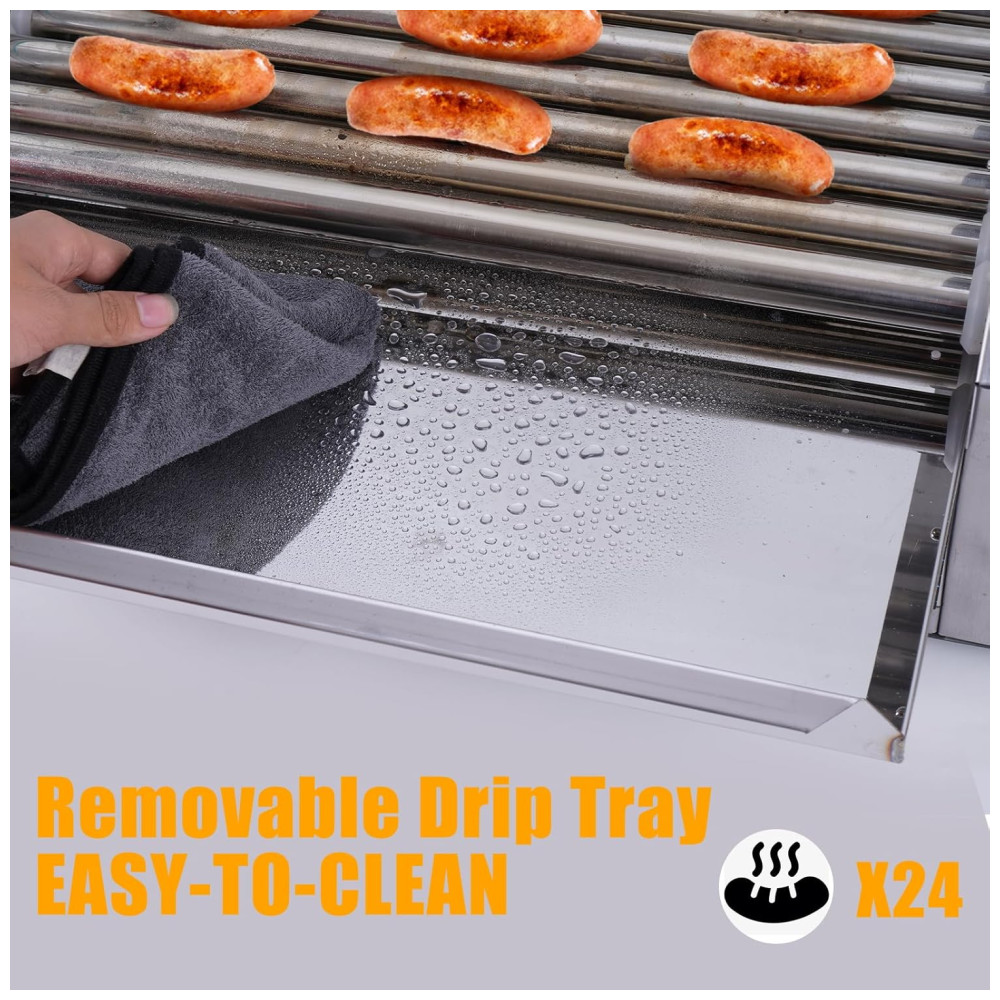A máquina de cachorro-quente doméstica oferece um desempenho excepcional com seus 7 rolos antiaderentes de aço inoxidável, capazes de cozinhar até 24 cachorros-quentes simultaneamente. Aprovada pela ETL para uso doméstico, é ideal para reuniões familiares e eventos festivos.