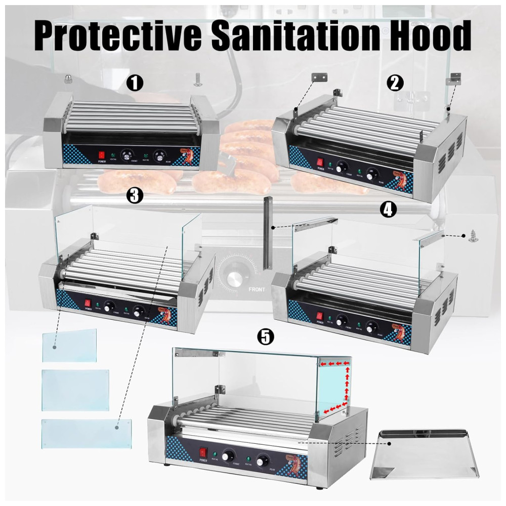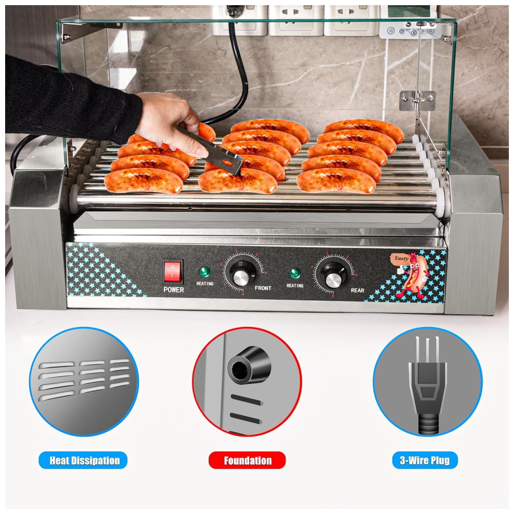 Os rolos giram 360 graus e podem completar até 45 rotações por minuto, assegurando que cada cachorro-quente seja aquecido de maneira uniforme. A máquina também conta com uma bandeja coletora removível de aço inoxidável, que facilita a limpeza e a manutenção.