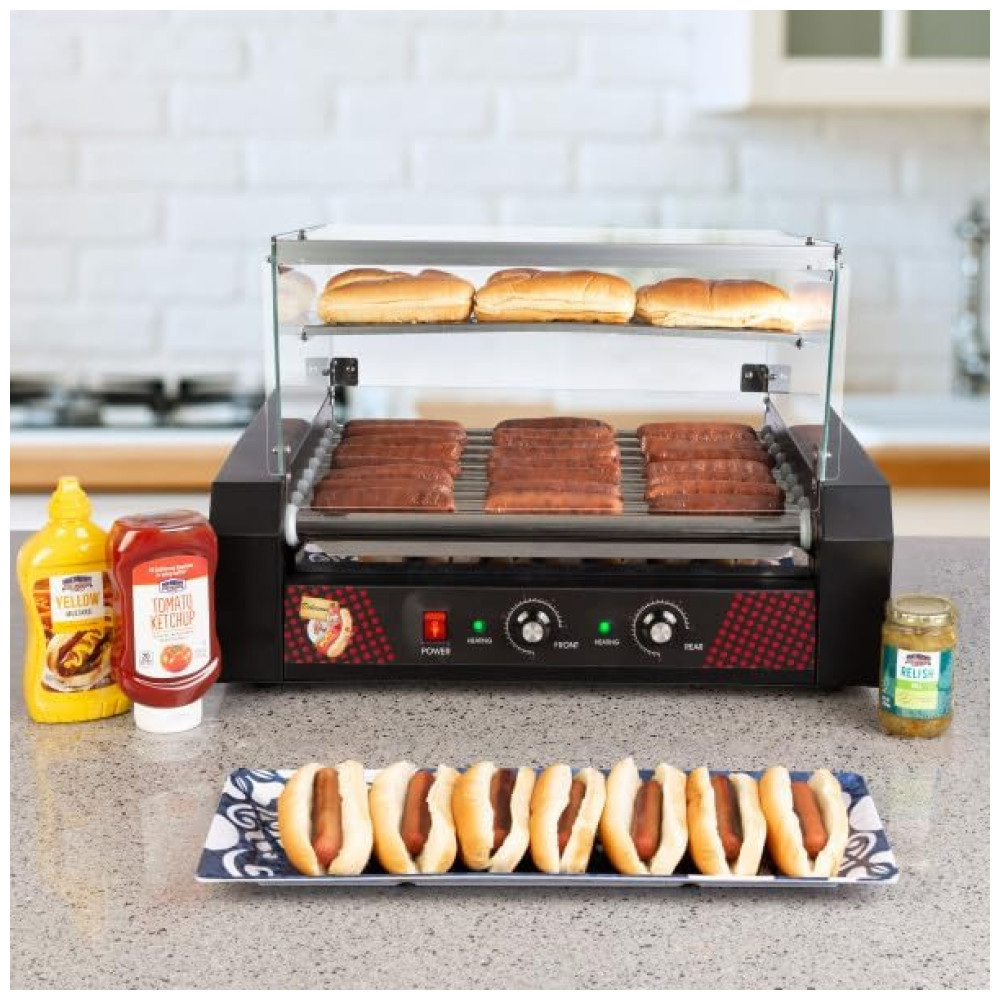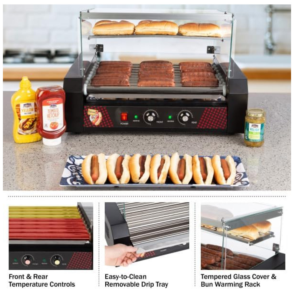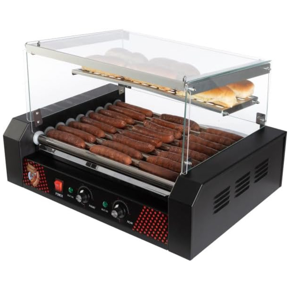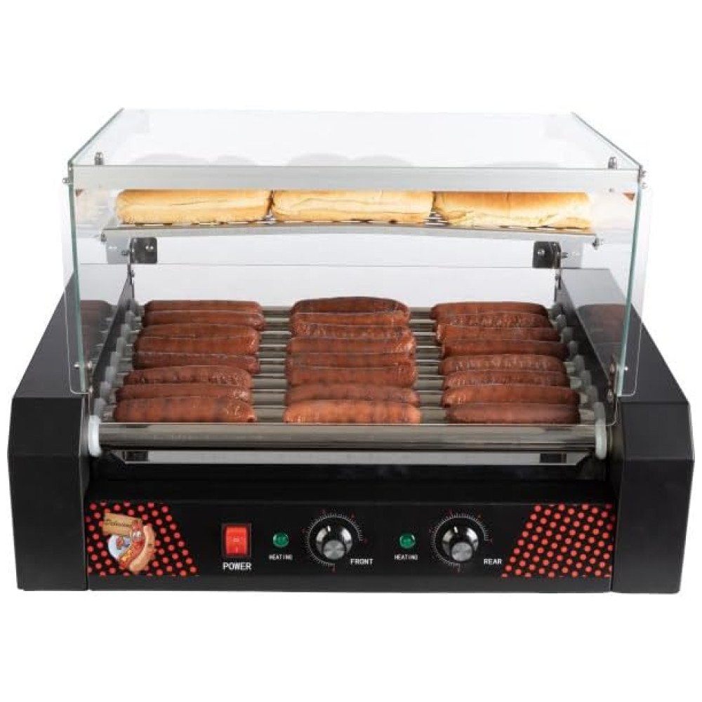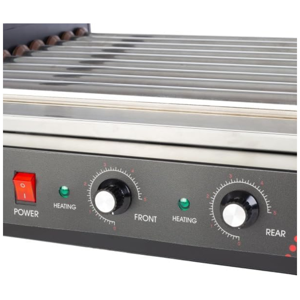 A tampa de vidro temperado com grade de malha embutida aquece até 68 pães de cachorro-quente, garantindo que estejam quentes e prontos para servir. Com controles de temperatura dupla e dois motores com controles separados para os rolos dianteiros e traseiros, a faixa de temperatura vai de 0 a 250°C (482°F). Isso permite assar nos rolos dianteiros enquanto usa os traseiros para manter os cachorros-quentes aquecidos.