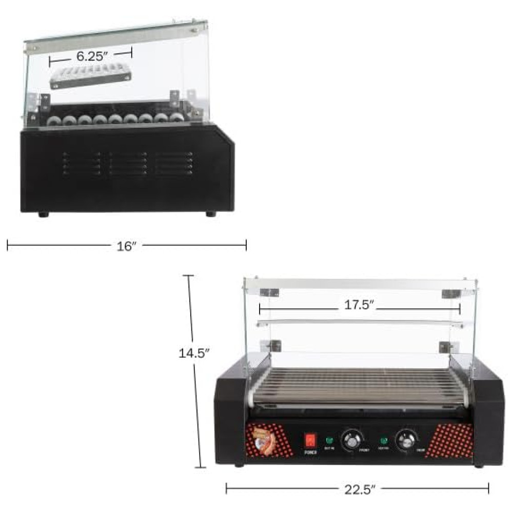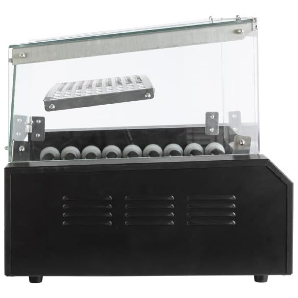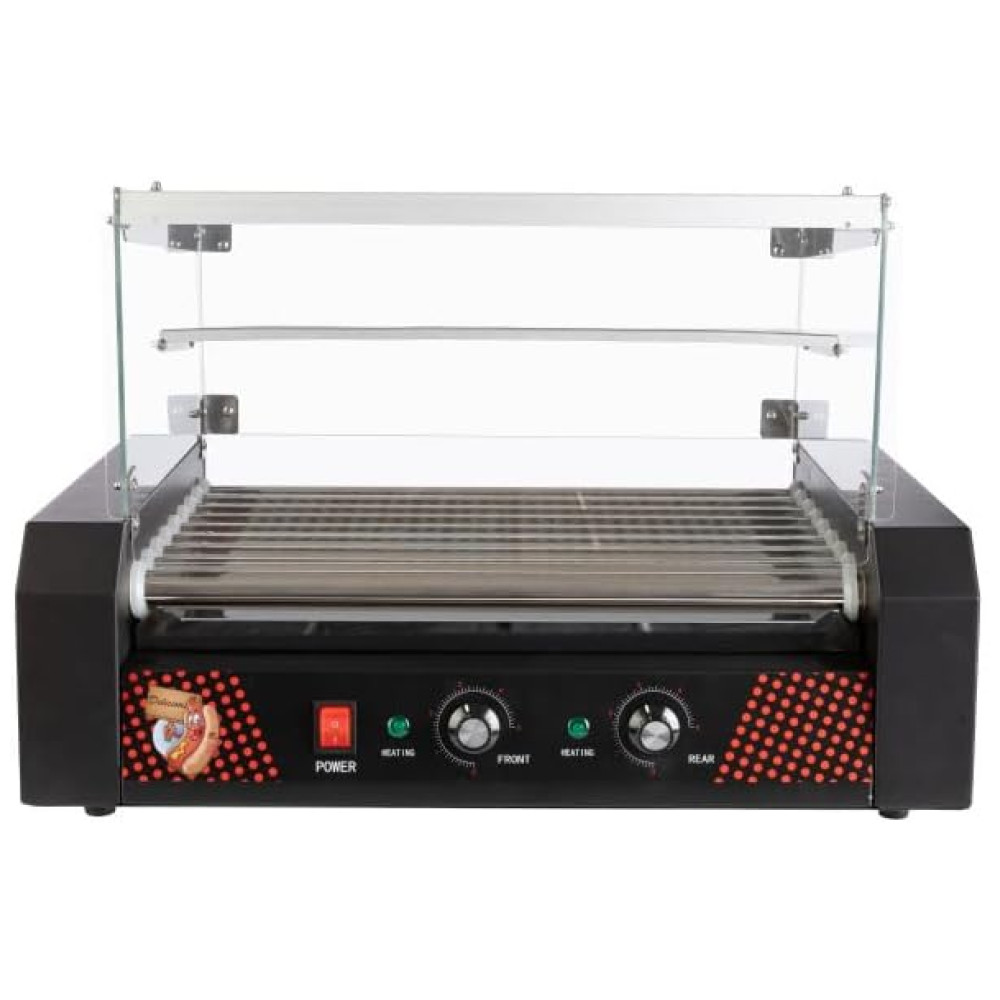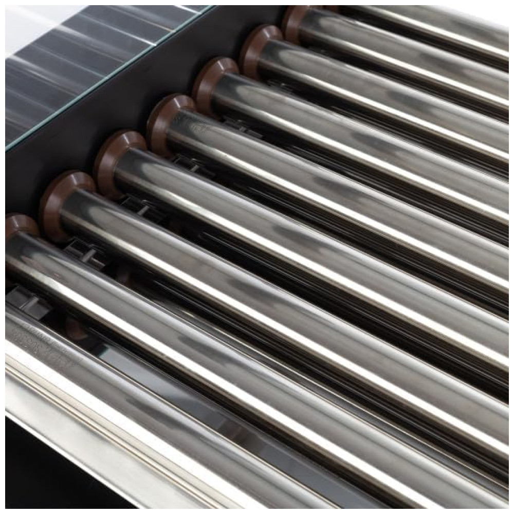 Prepare salsichas estilo rotisserie em minutos com o Hotdog Grill Roller da Great Northern Popcorn. Com 9 rolos de aço inoxidável que giram 360 graus, esta máquina pode preparar até 24 cachorros-quentes por lote, oferecendo uma solução prática para grandes quantidades.