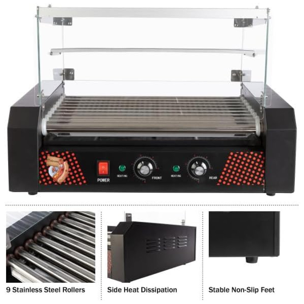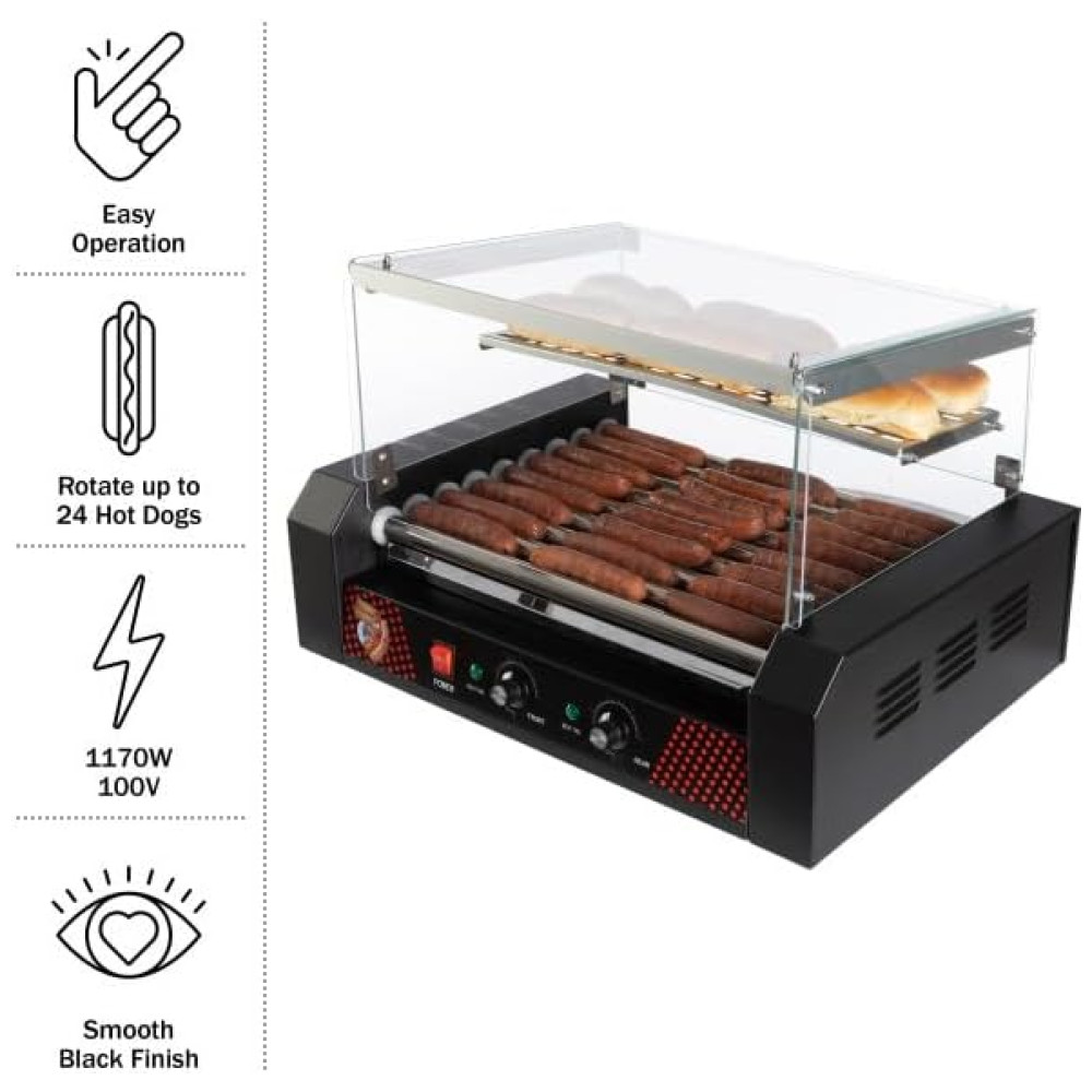 Máquina de Cachorro Quente em Aço Inoxidável até 24 Salsichas com Aquecedor de Pão Bandeja Coletora Removível e Tampa 110V 1217W ROVSUN Preta