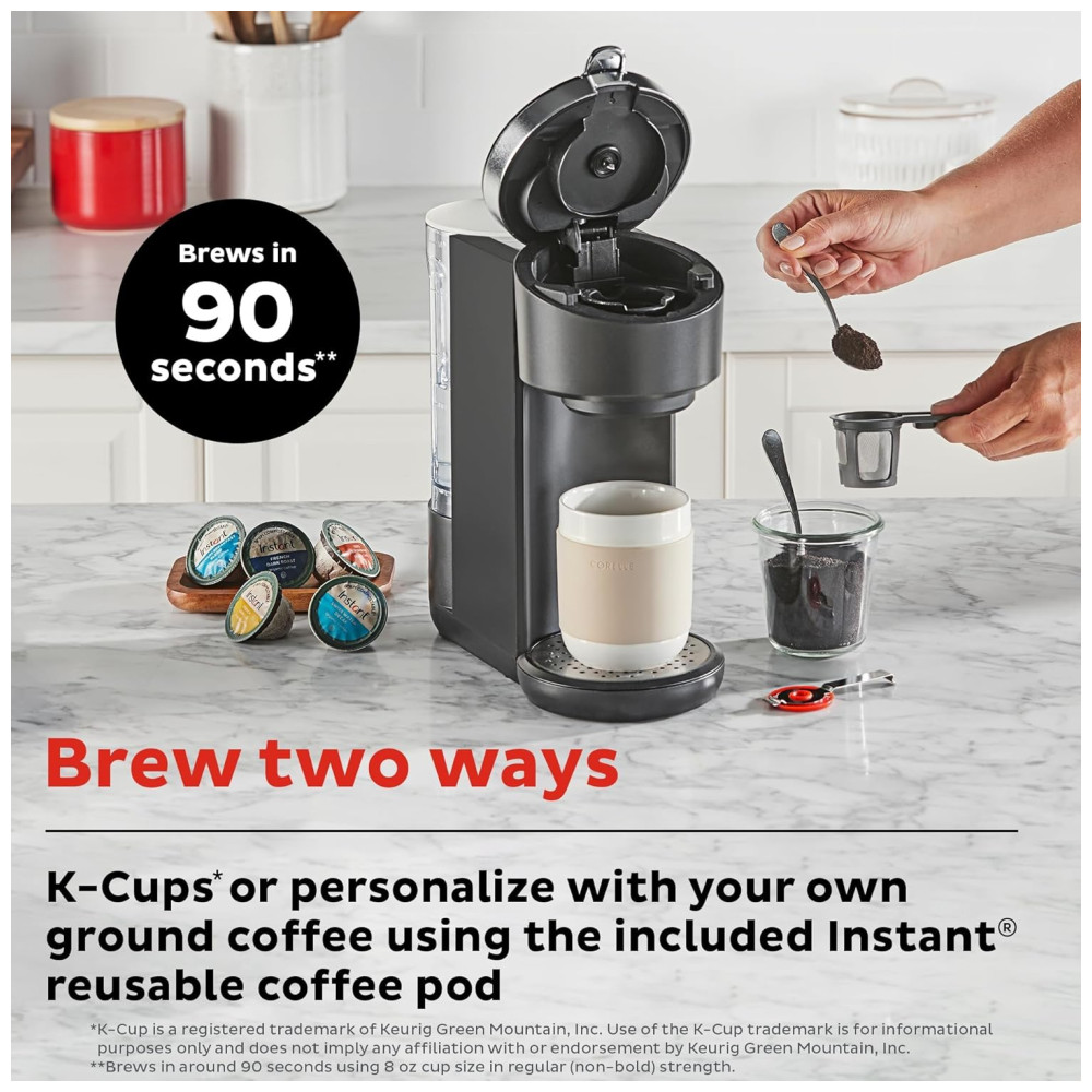 A cafeteira Solo SingleServe 2 em 1 é a escolha perfeita para quem deseja preparar uma xícara de café deliciosa em casa. Ela é compatível com pods KCup e com terrenos de café, que podem ser utilizados no pod reutilizável incluído com alça. Com o uso da cápsula reutilizável no Instant Solo, é possível extrair mais sabor, aroma e corpo do seu café moído favorito. A cafeteira oferece vários tamanhos de bebida, com opções de xícaras de 236mL, 295mL e 355mL, e permite ajustar a intensidade da bebida para torná la tão ousada quanto desejar.