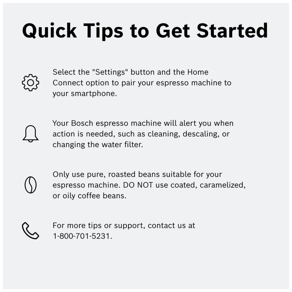 Aproveite a máxima conveniência com recursos importantes, como a iluminação do copo e o programa guiado de limpeza e descalcificação, Calcn Clean. A máquina de café expresso totalmente automática Bosch VeroCafe 800 Series TPU60501 vem com um filtro de água Mavea, um filtro de água Mavea Auxiliar de inserção, uma mangueira de conexão para bocal de leite, um pano de microfibra, um conjunto de 2 pastilhas de limpeza e 1 de descalcificação, um recipiente de leite de vidro, um manual do usuário e uma tira de teste de dureza da água.