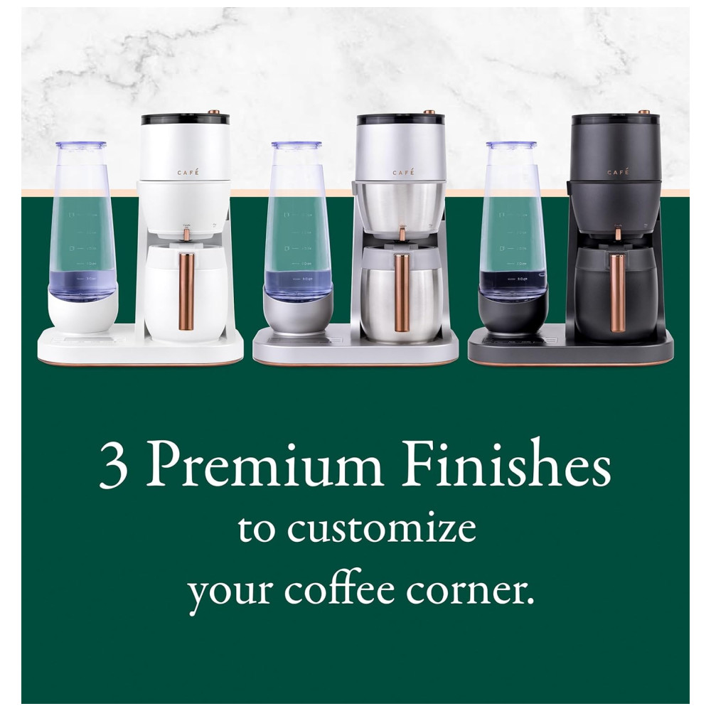 Adicione um toque de ousadia à sua cozinha com esta elegante cafeteira. Disponível em três acabamentos diferentes Branco fosco, Preto fosco e Aço inoxidável todos com detalhes em cobre Caf exclusivos, ela é perfeita para quem busca um design sofisticado.