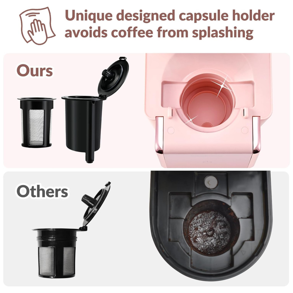 Com dois porta filtros inclusos, um para cápsulas de café Kcup e outro para café moído, é possível desfrutar de diferentes tipos de bebidas com esta pequena cafeteira. Seu design compacto economiza espaço na bancada e é adequado para viagens, sendo especialmente útil para RVs, dormitórios e apartamentos.