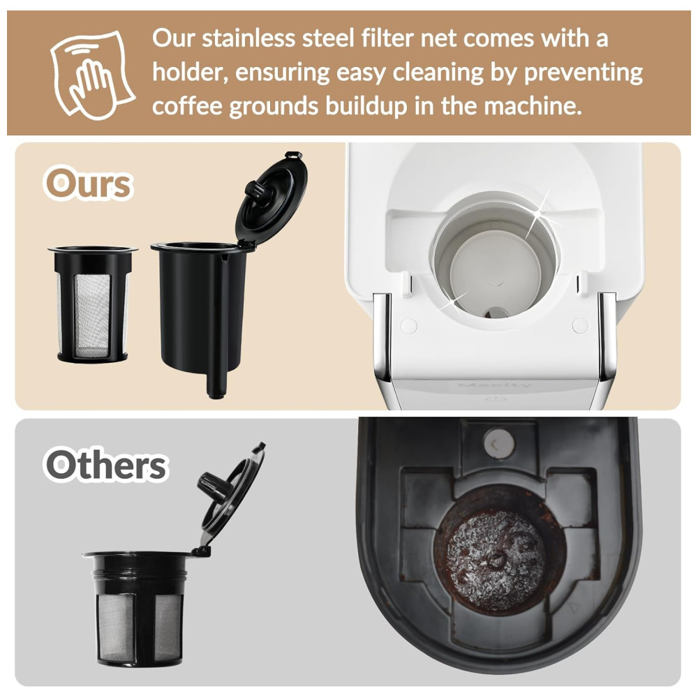 Para facilitar a limpeza, a máquina de café Mecity utiliza um porta filtro de design exclusivo que torna a câmara de preparação fácil de limpar, evitando a produção de odores. O modo de descalcificação pode ser ativado pressionando o botão liga desliga por 3 segundos, e um indicador vermelho começará a piscar.