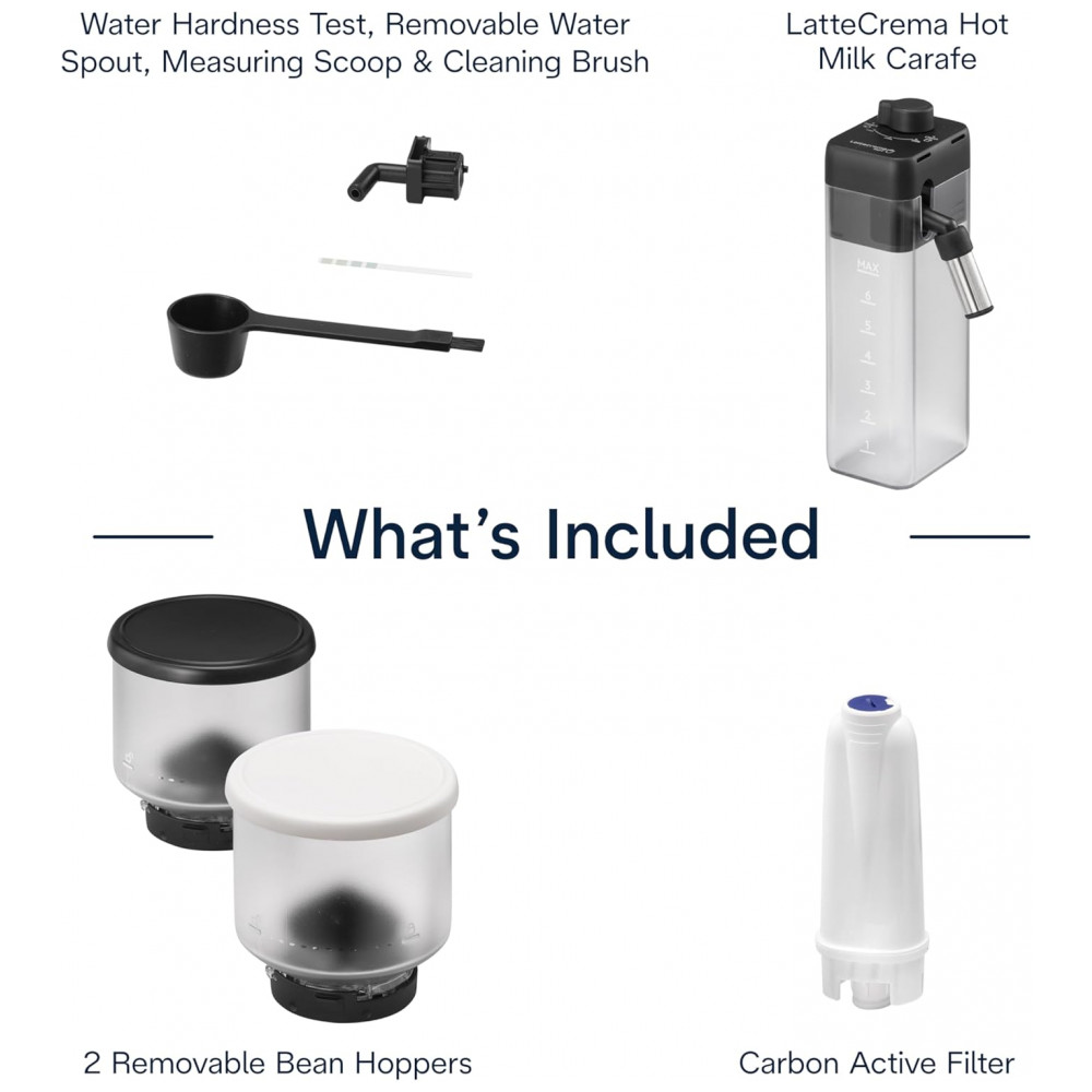 Acessórios: Jarra para leite quente, escova de limpeza, colher medidora, filtro reutilizável, teste de dureza da água