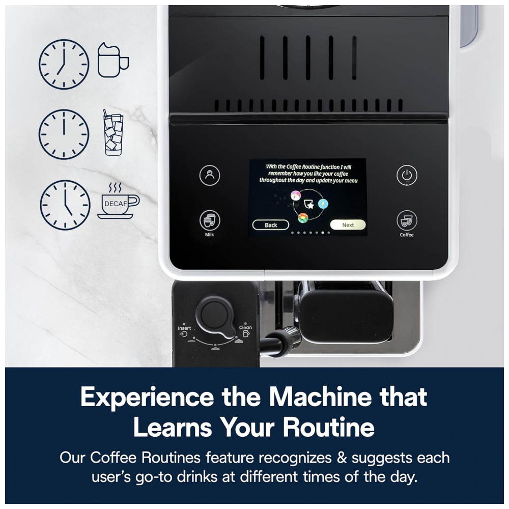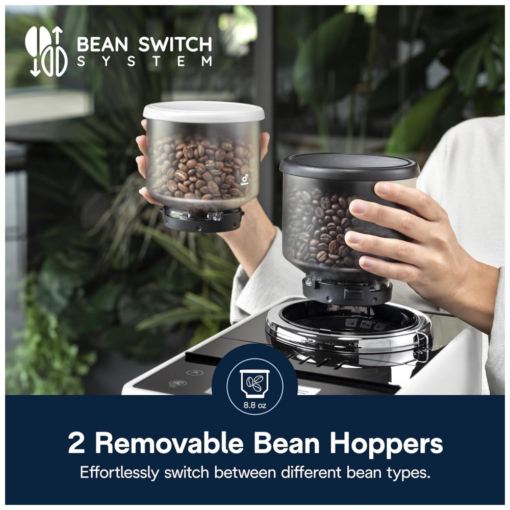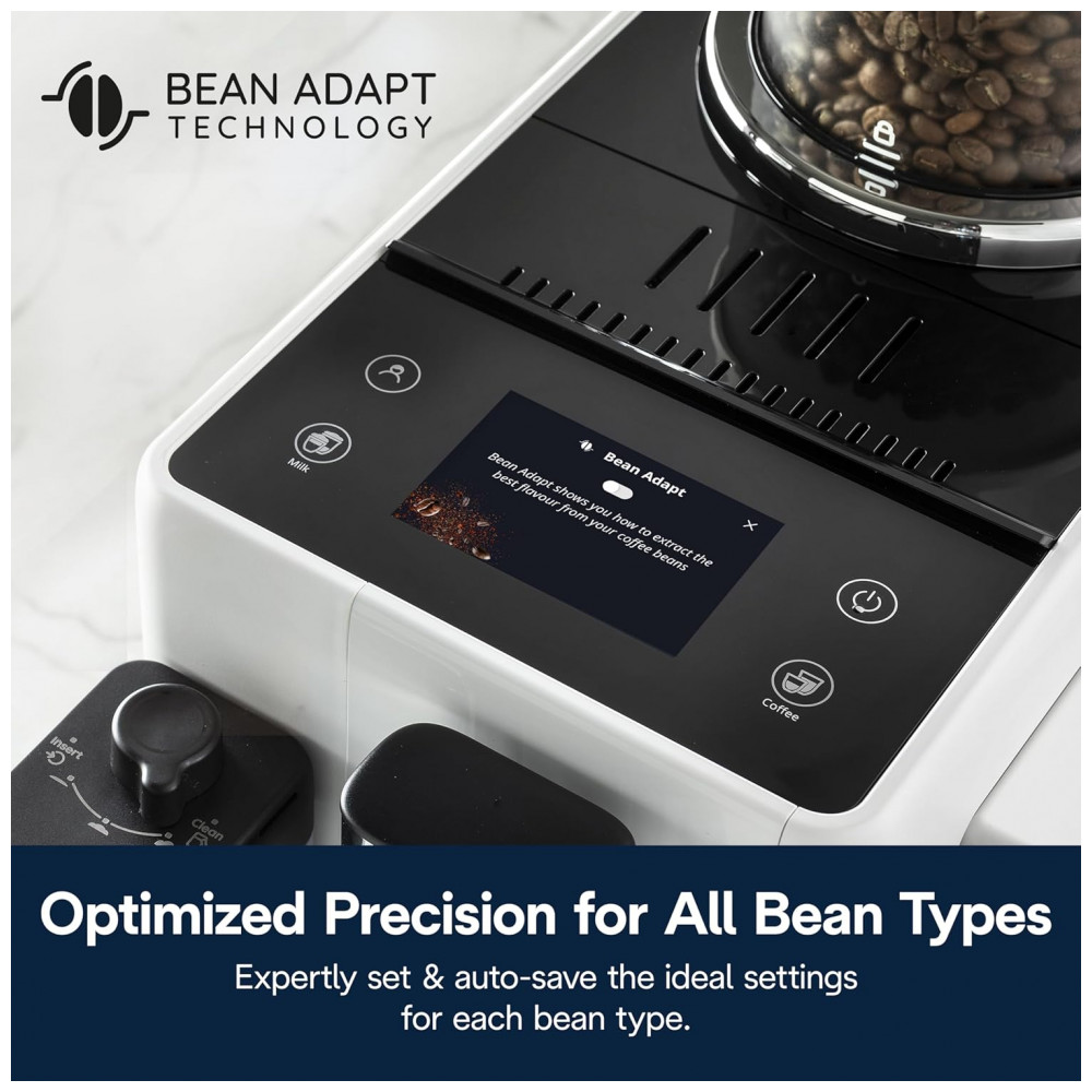 A Máquina de Café Espresso Automática De’Longhi Rivelia na cor branca combina moagem, dosagem, preparo e espumação com operação por toque único. Equipado com dois compartimentos removíveis para feijões com capacidade de 250 g cada, permite alternar rapidamente entre diferentes tipos grãos antes da moagem, feita por moedor cônico com 13 ajustes de granulação.