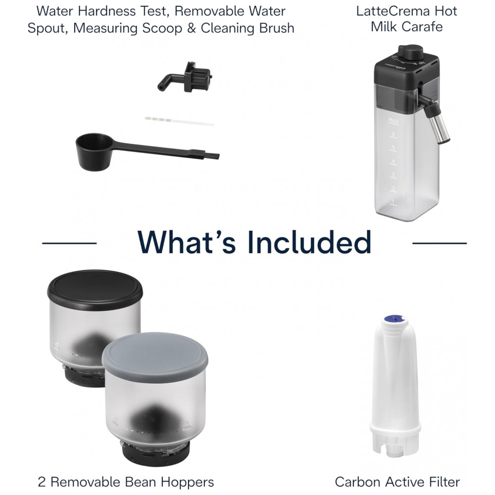 Acessórios inclusos: Jarra para leite quente, escova de limpeza, colher medidora, filtro reutilizável, teste de dureza da água