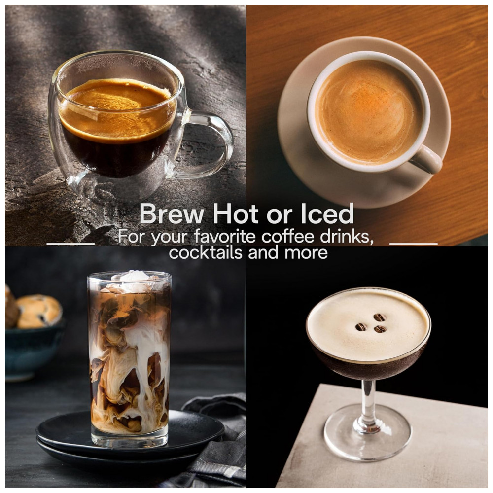Com potência de 1450 watts e voltagem de 110 V, a máquina tem design moderno em plástico resistente e dimensões compactas adequadas para uso doméstico ou escritório. Acompanha acessórios como jarra para leite quente, escova de limpeza, colher medidora, filtro reutilizável e teste de dureza da água.