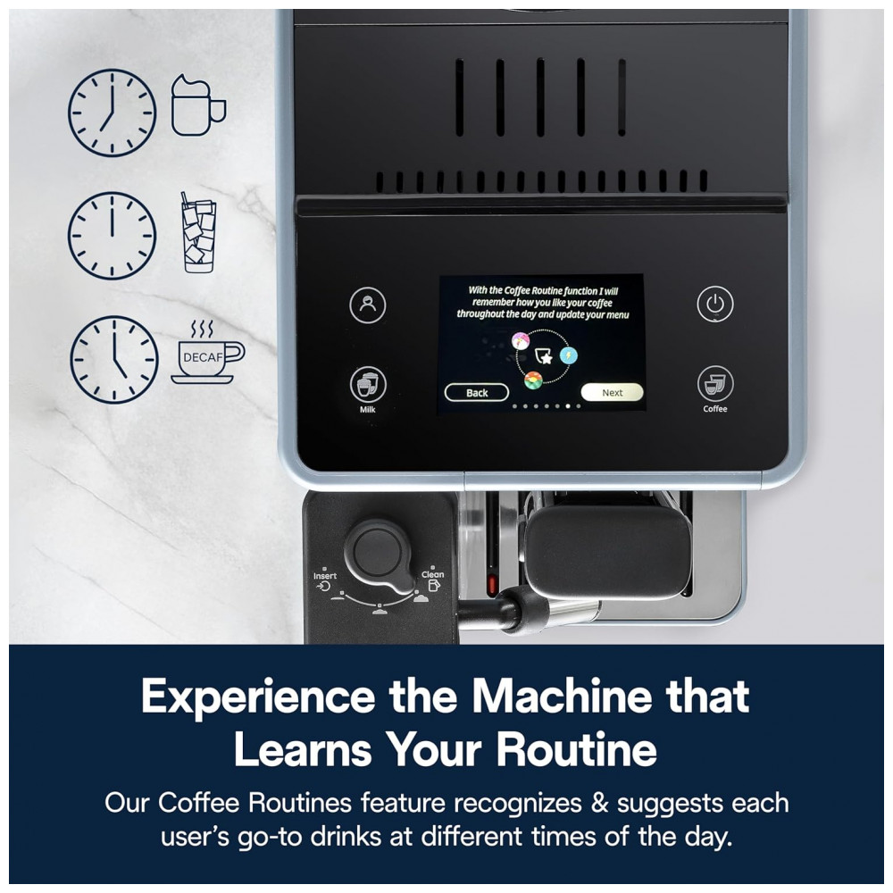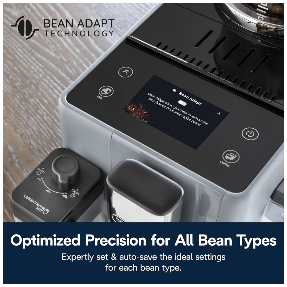 O sistema LatteCrema Hot permite espumar leite e bebidas vegetais automaticamente, com função de autolimpeza. A interface touchscreen colorida de 3,5 polegadas facilita o acesso a 18 receitas predefinidas, incluindo espresso, latte, cappuccino, café gelado e mais. É possível ajustar a intensidade, quantidade e adicionar dose extra de café para personalizar a bebida. Conta com sistema de aquecimento ThermaBlock e pressão de 15 bar para extração ideal do espresso. Reservatório de água transparente de 1,4 litro removível para fácil reposição e limpeza.