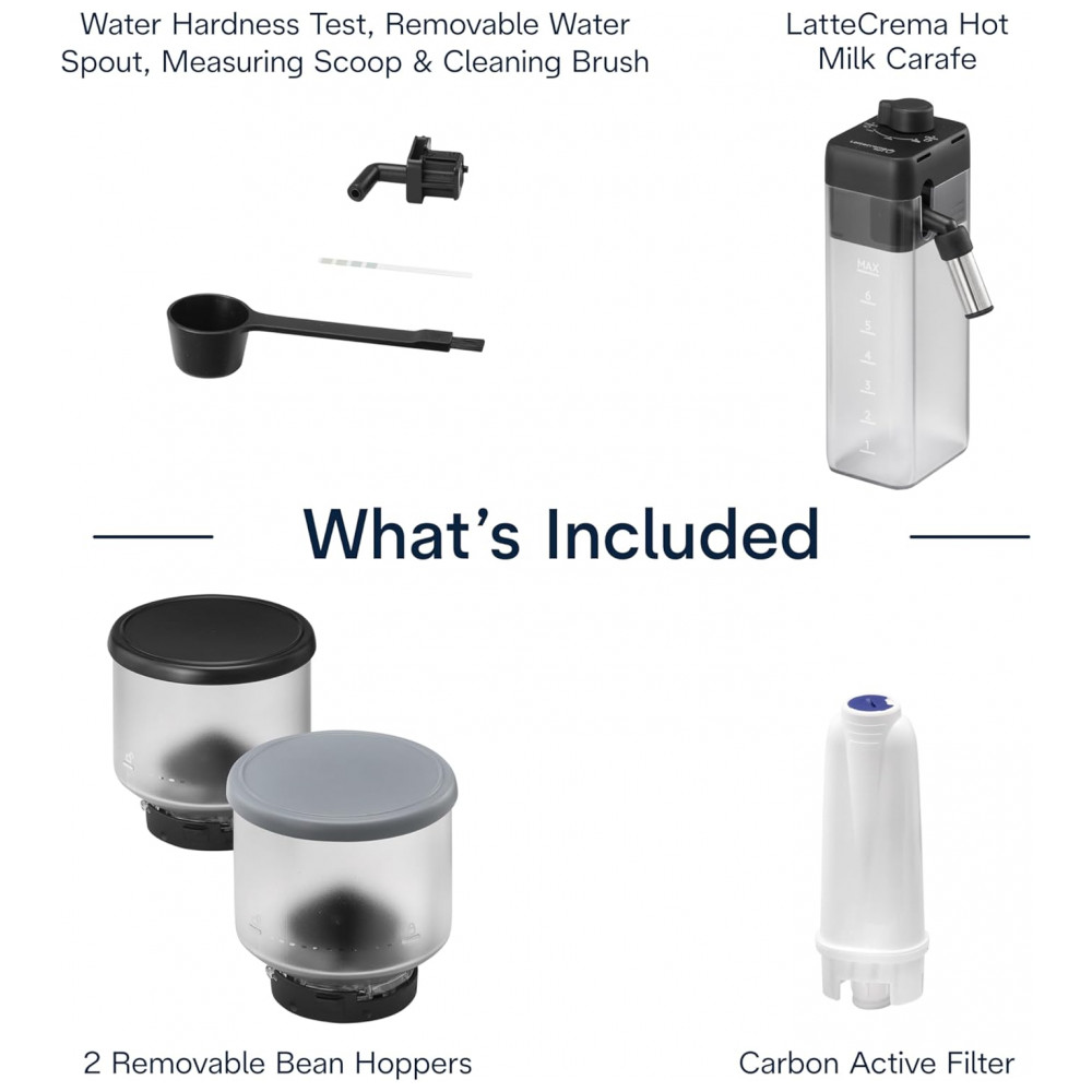Acessórios incluídos: Jarra de leite quente, escova de limpeza, colher medidora, filtro reutilizável, teste de dureza da água