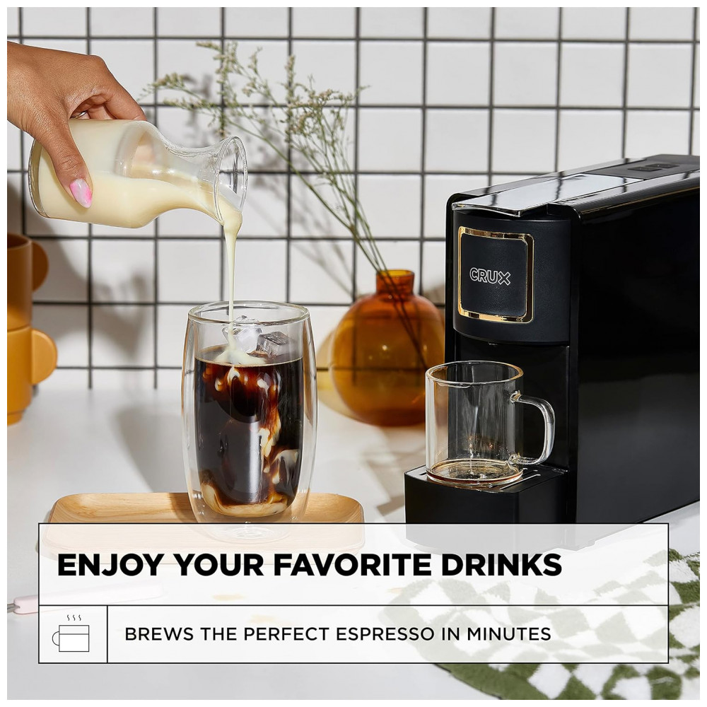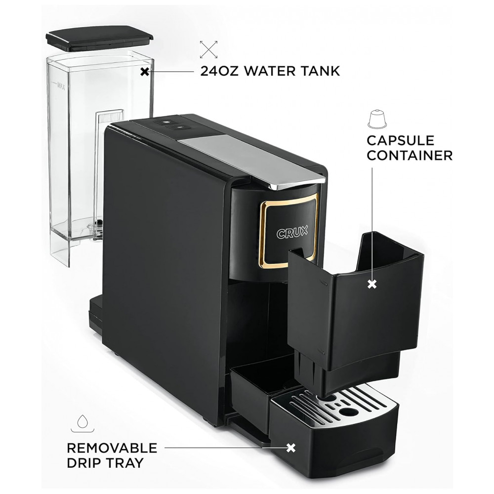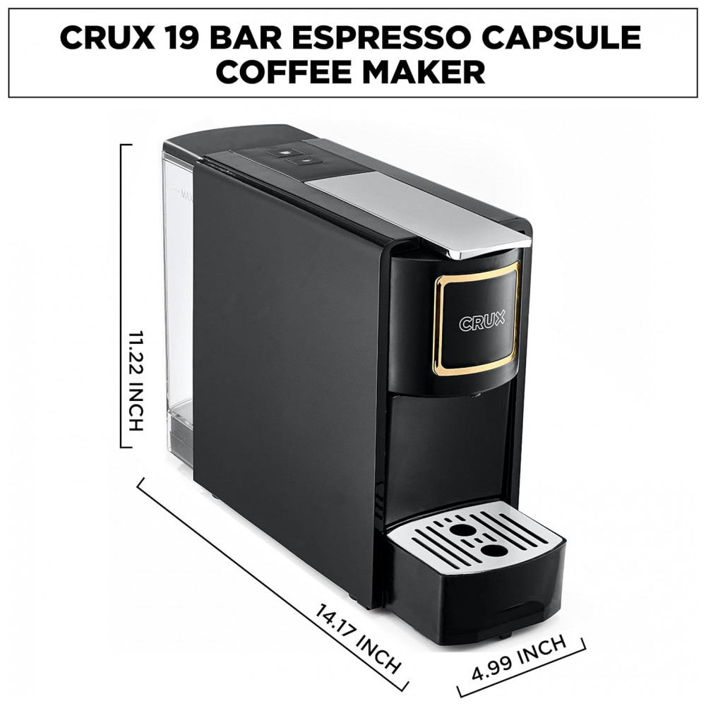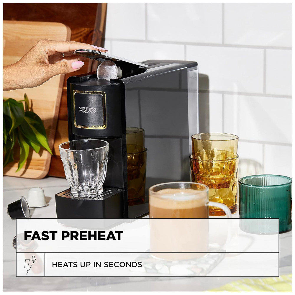 BREW LIKE A PRO Desfrute de café com qualidade de barista no conforto da sua casa. Com um poderoso sistema de preparo e 19 bar de pressão, a máquina de café expresso CRUX cria uma xícara perfeita sempre. Totalmente programável, é compatível com as cápsulas da linha Nespresso.