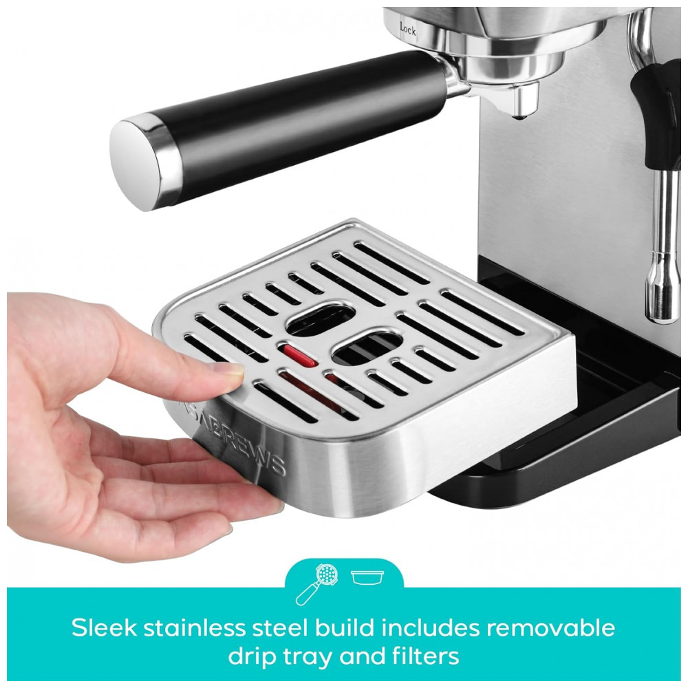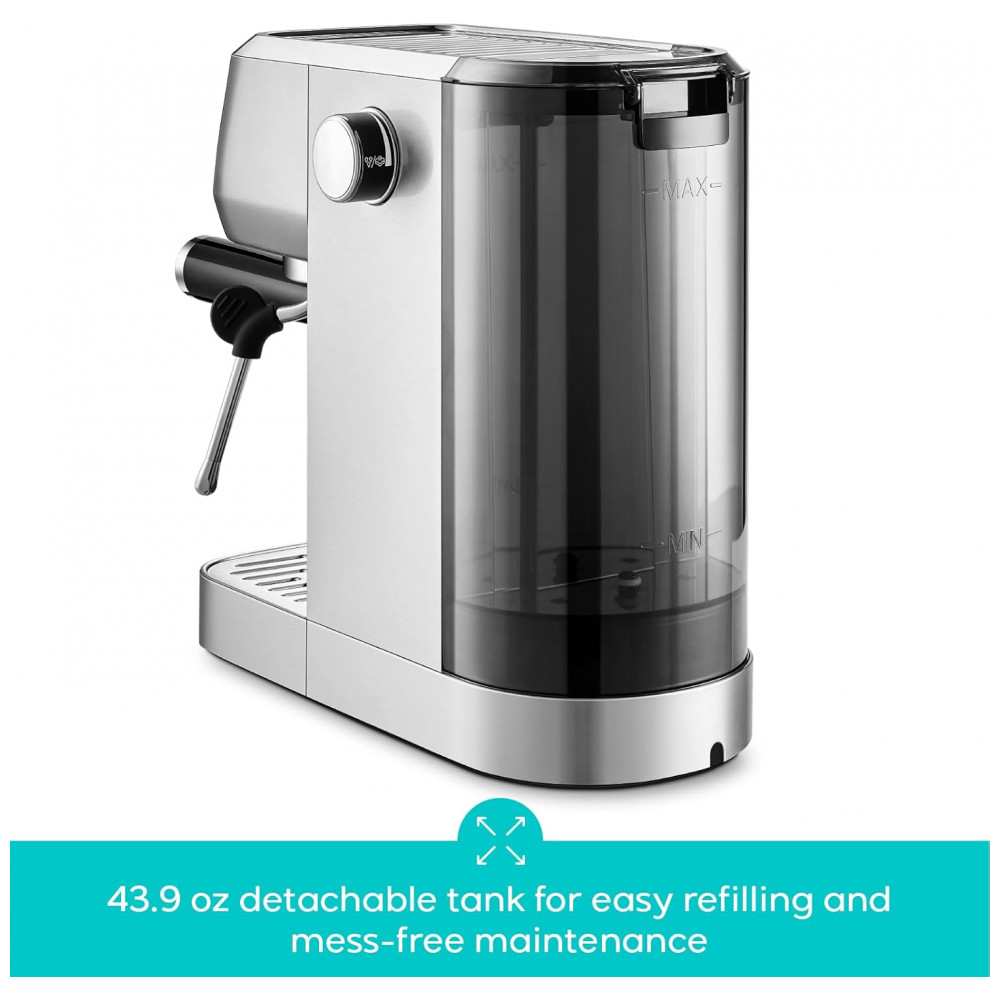 COMPACTO, ESTILOSO E PRÁTICO O design compacto torna esta máquina de café expresso adequada para cozinhas de qualquer tamanho. O tanque de água de 49 oz permite preparar vários copos e é destacável para facilitar o reabastecimento. A bandeja coletora se abre para que você possa enxaguá la. Esta máquina de café expresso doméstica vem com tudo que um amante de café precisa para começar. Componentes incluídos máquina de café expresso, tanque de água removível de 1.4L, filtro de cerveja de uma xícara, filtro de cerveja de duas xícaras, portafiler, adulteração com colher, manual de instruções