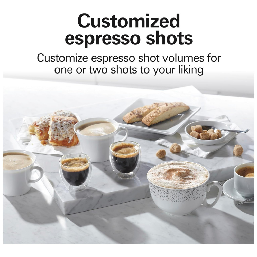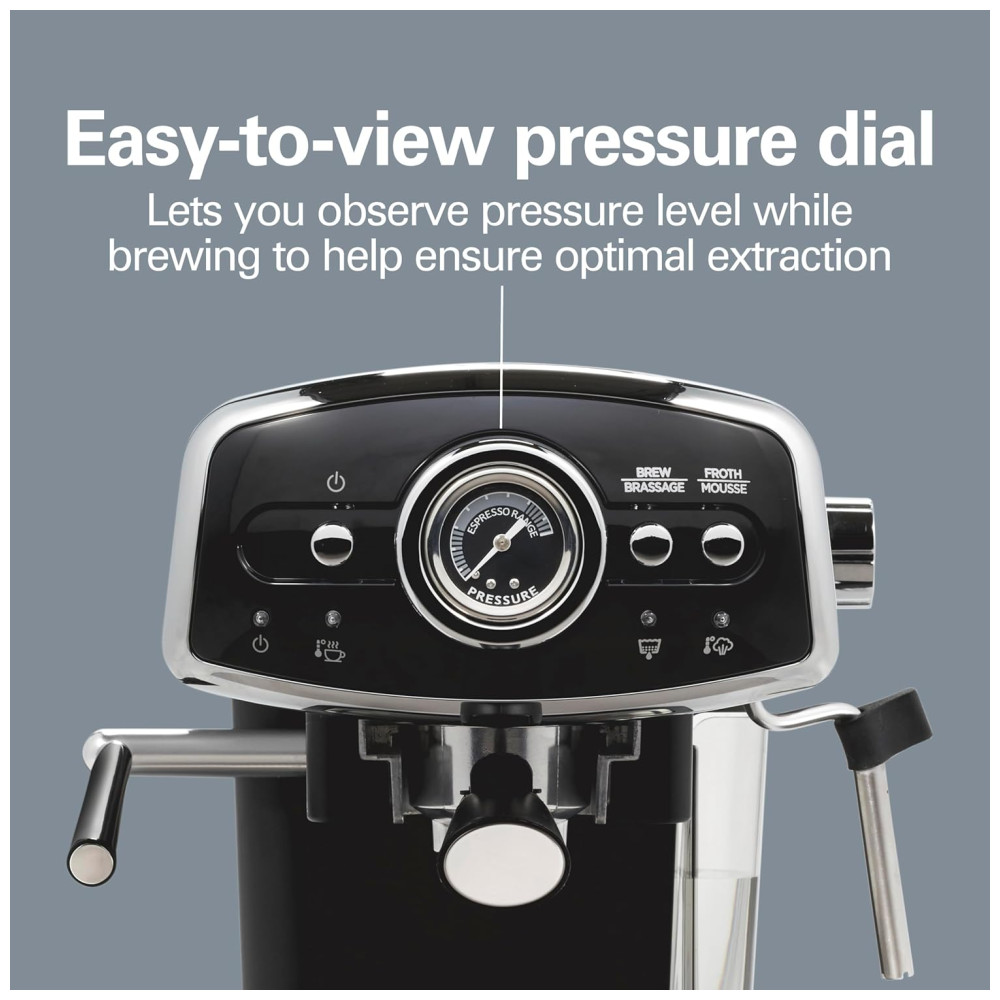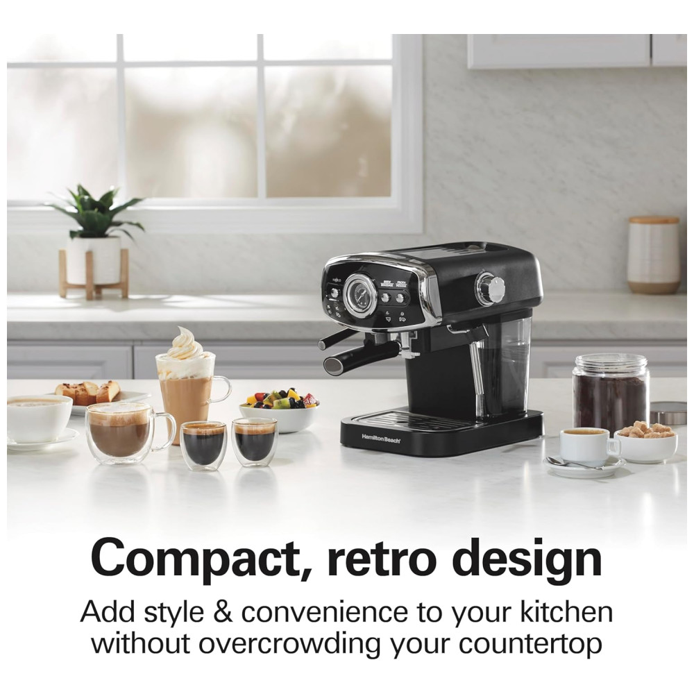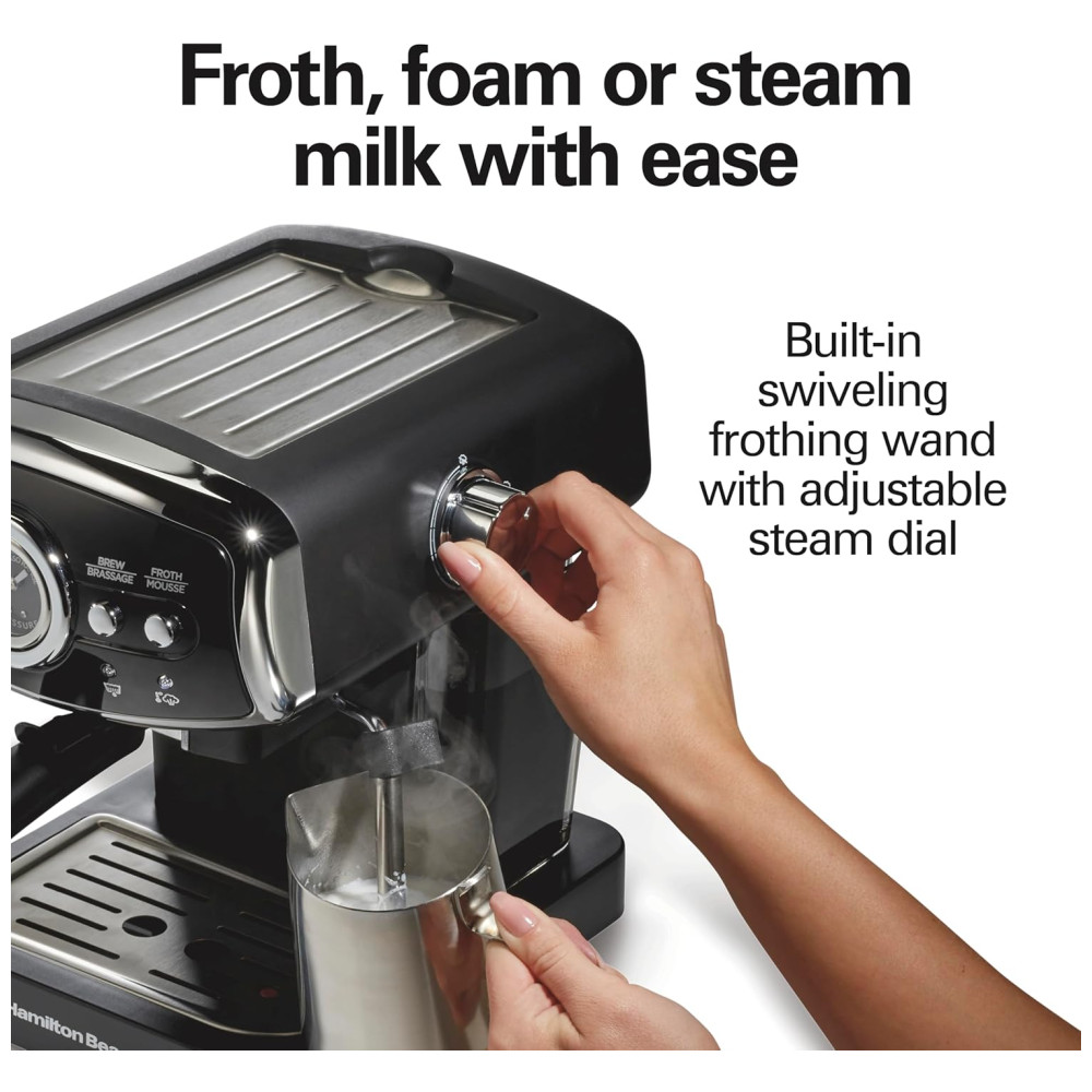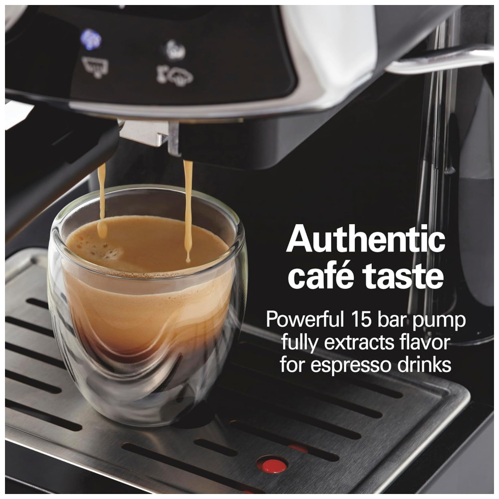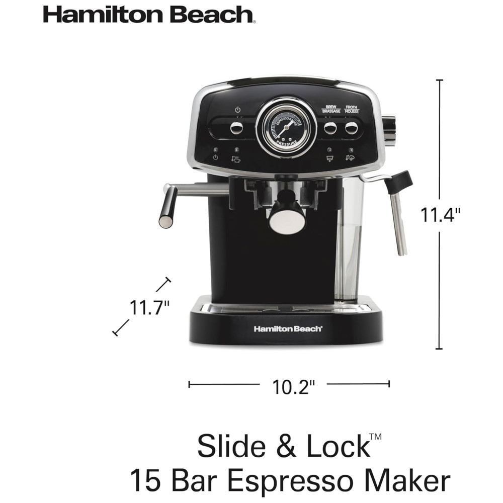 Máquina de Café Expresso 15 Bar com Bocal de Leite 2 Bicos e Reservatório Removível 110V 1050W Hamilton Beach Slide Lock Preta