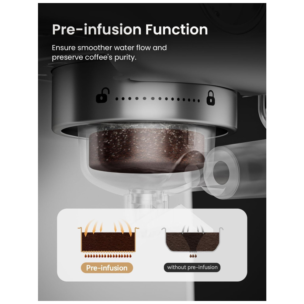 A Máquina de café expresso para home office é perfeita para quem busca preparar café expresso, cappuccino e lattes de qualidade barista sem esforço. Com um poderoso sistema de pressão profissional de 15 bar, é possível extrair café de alta qualidade e criar bebidas favoritas. O manômetro integrado mostra a pressão exata, permitindo ajustes de acordo com as preferências pessoais de gosto.