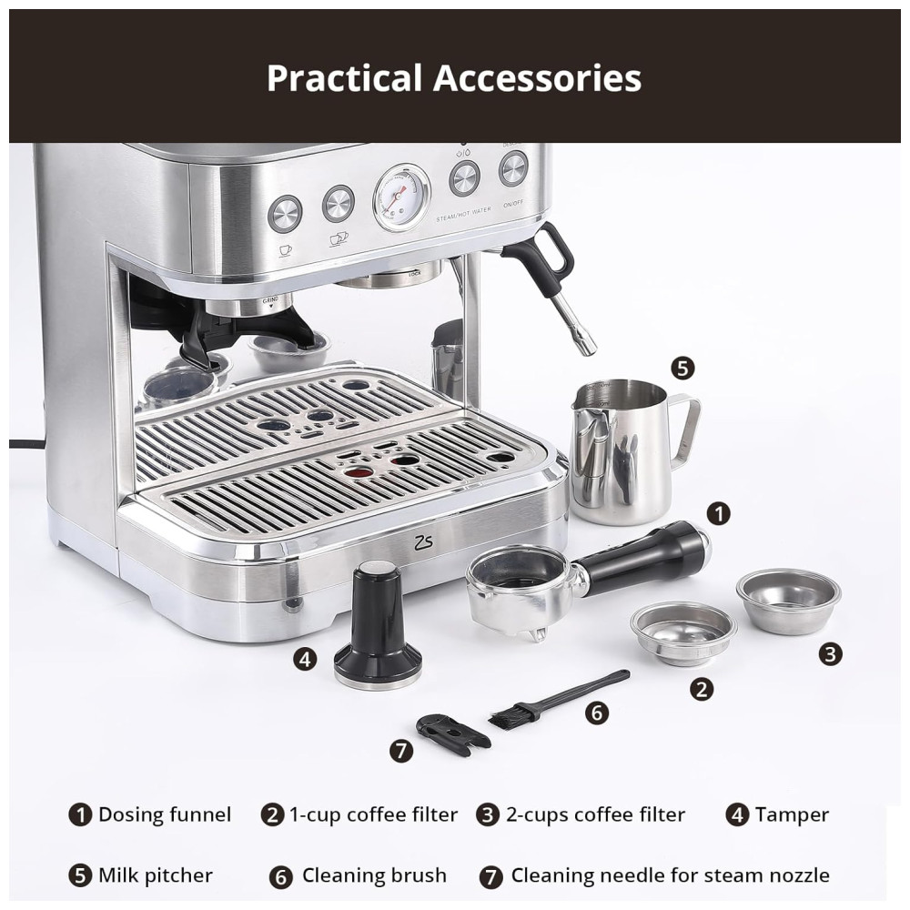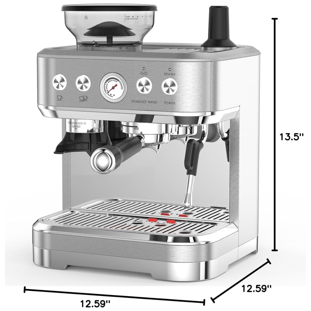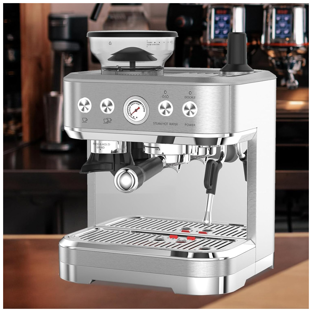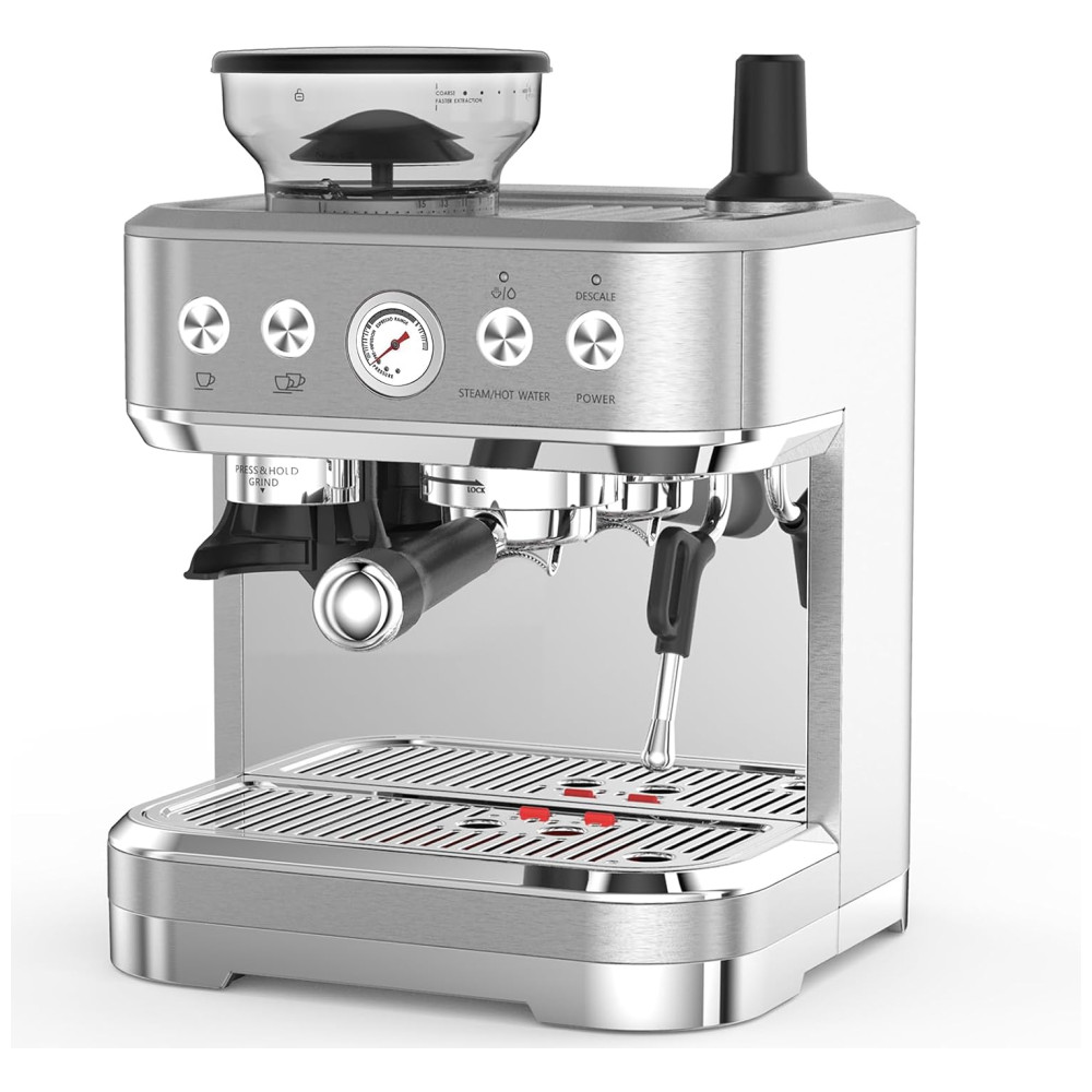 Máquina de Café Expresso 15 Bar com Vaporizador de Leite Moedor Embutido Desligamento Automático e Tanque de Água Removível de 25L 110V Takywep Prata