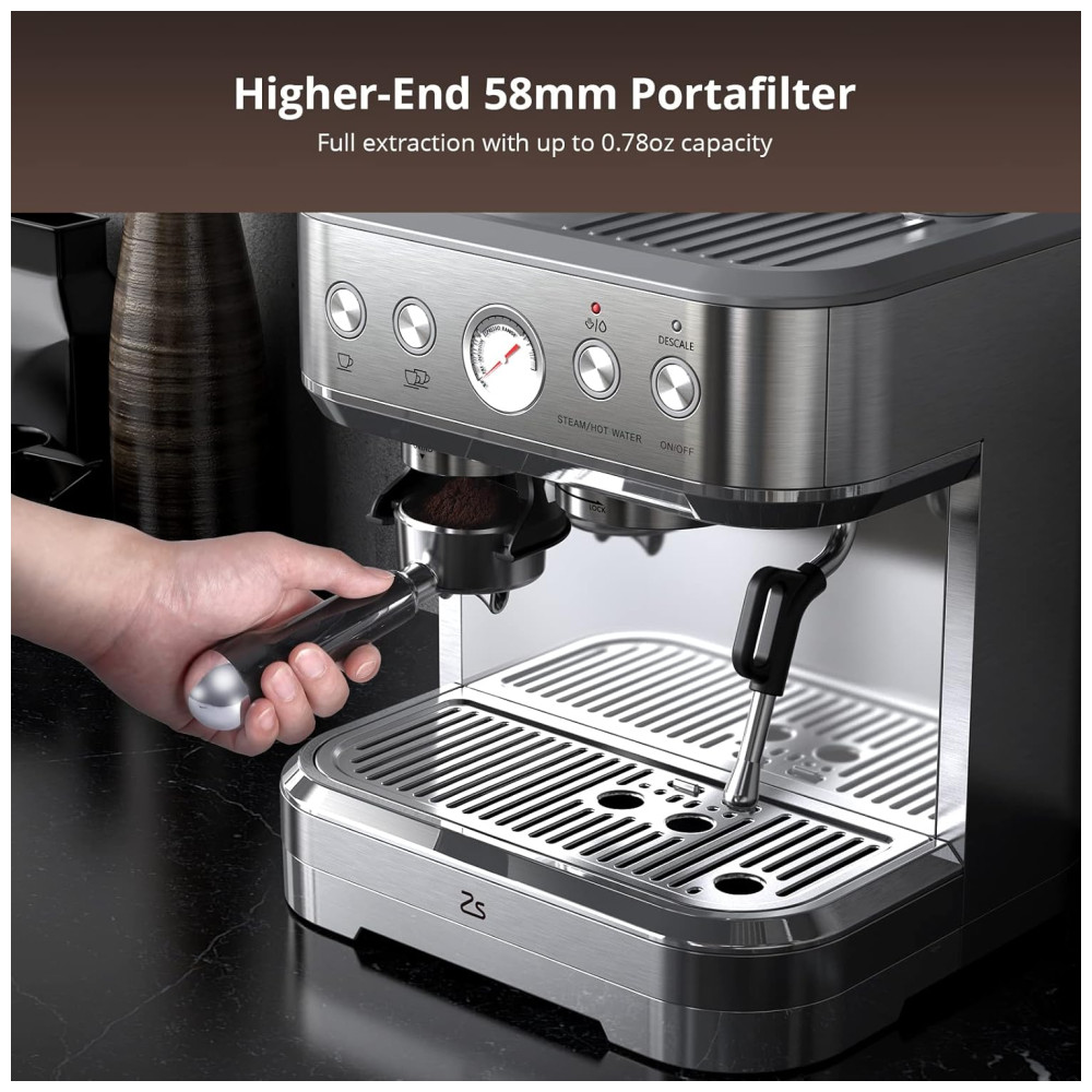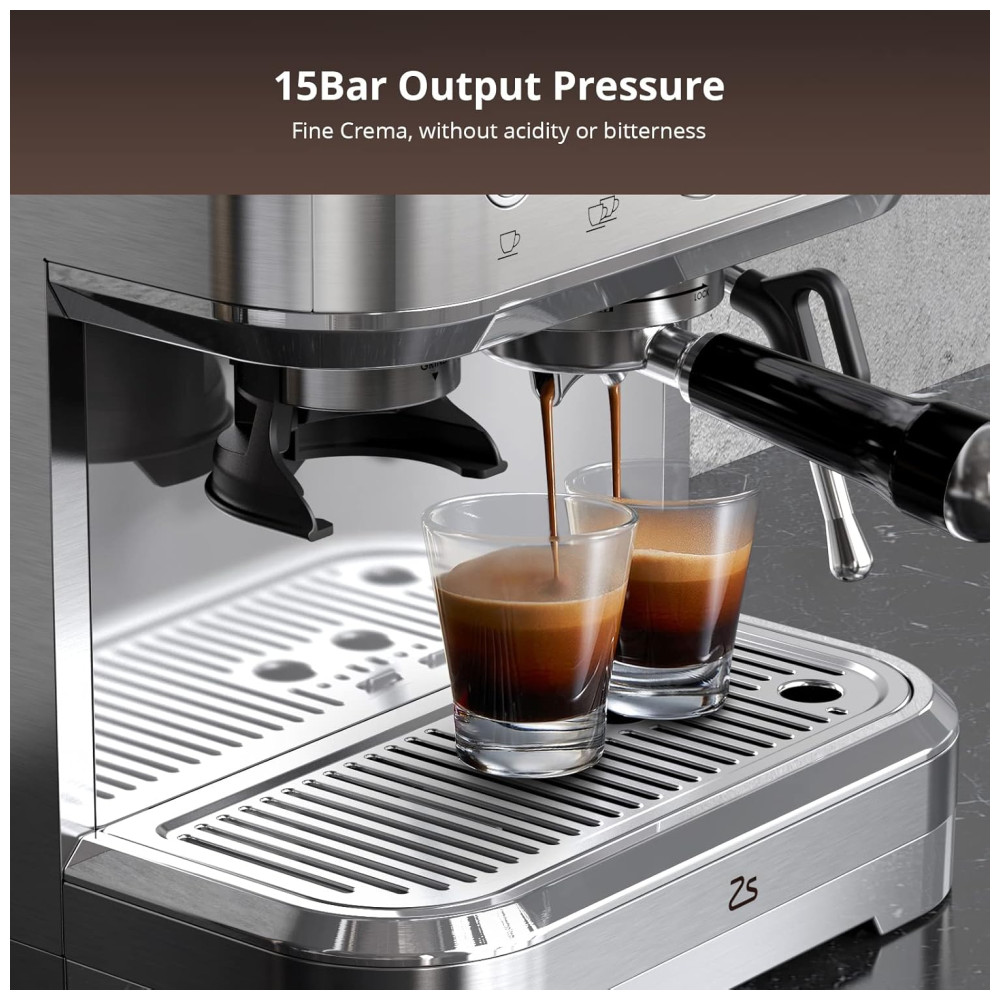 Desfrute de uma experiência de café personalizada com nossa máquina de café expresso profissional. Com 15 opções de tamanhos de moagem, o moedor cônico integrado proporciona uma moagem uniforme, desde grossa até ultrafina. Os dois porta-filtros de 58 mm permitem criar um creme rico e aveludado, ideal para lattes autênticos, cappuccinos, americanos e muito mais.