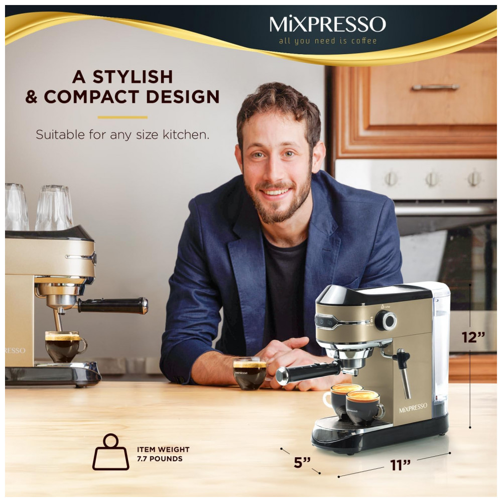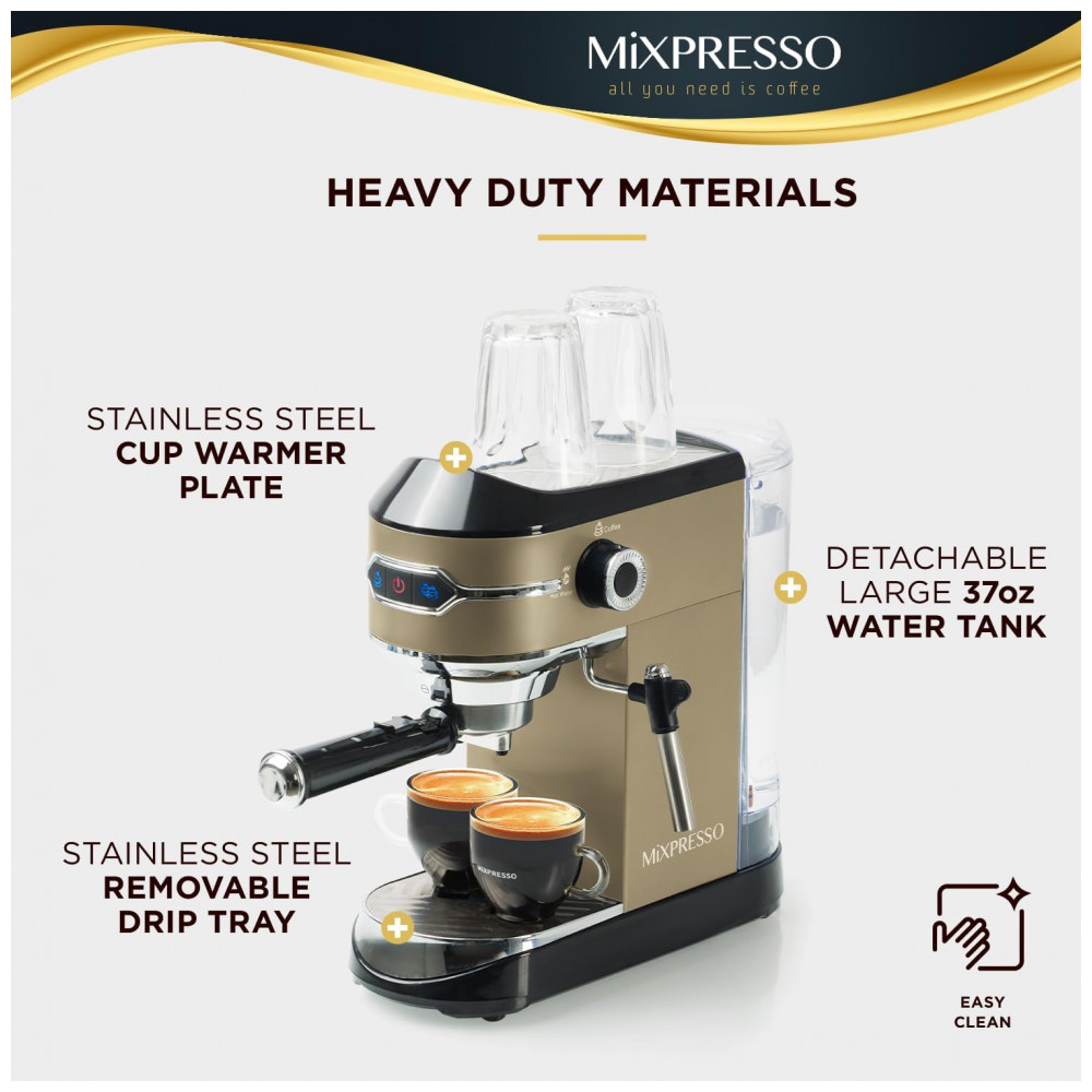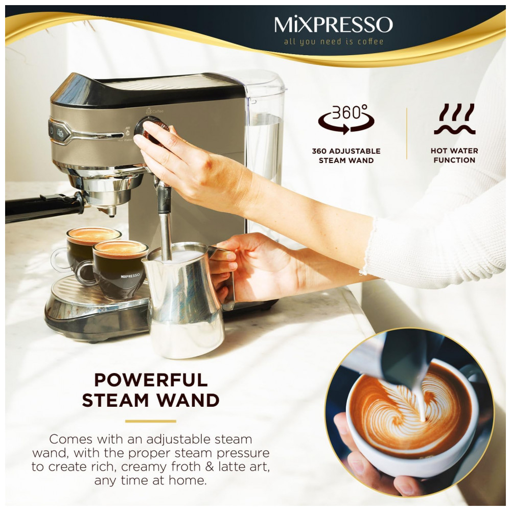 MÁQUINA DE EXPRESSO PROFISSIONAL Nossa máquina de expresso Mixpresso é equipada com bomba de 15 barras profissionais para garantir sempre resultados de qualidade. Um potente motor de 1450 W com controles ajustáveis permite que você modifique suas preferências de gosto pessoal para ser um barista e preparar seu café expresso favorito em casa.