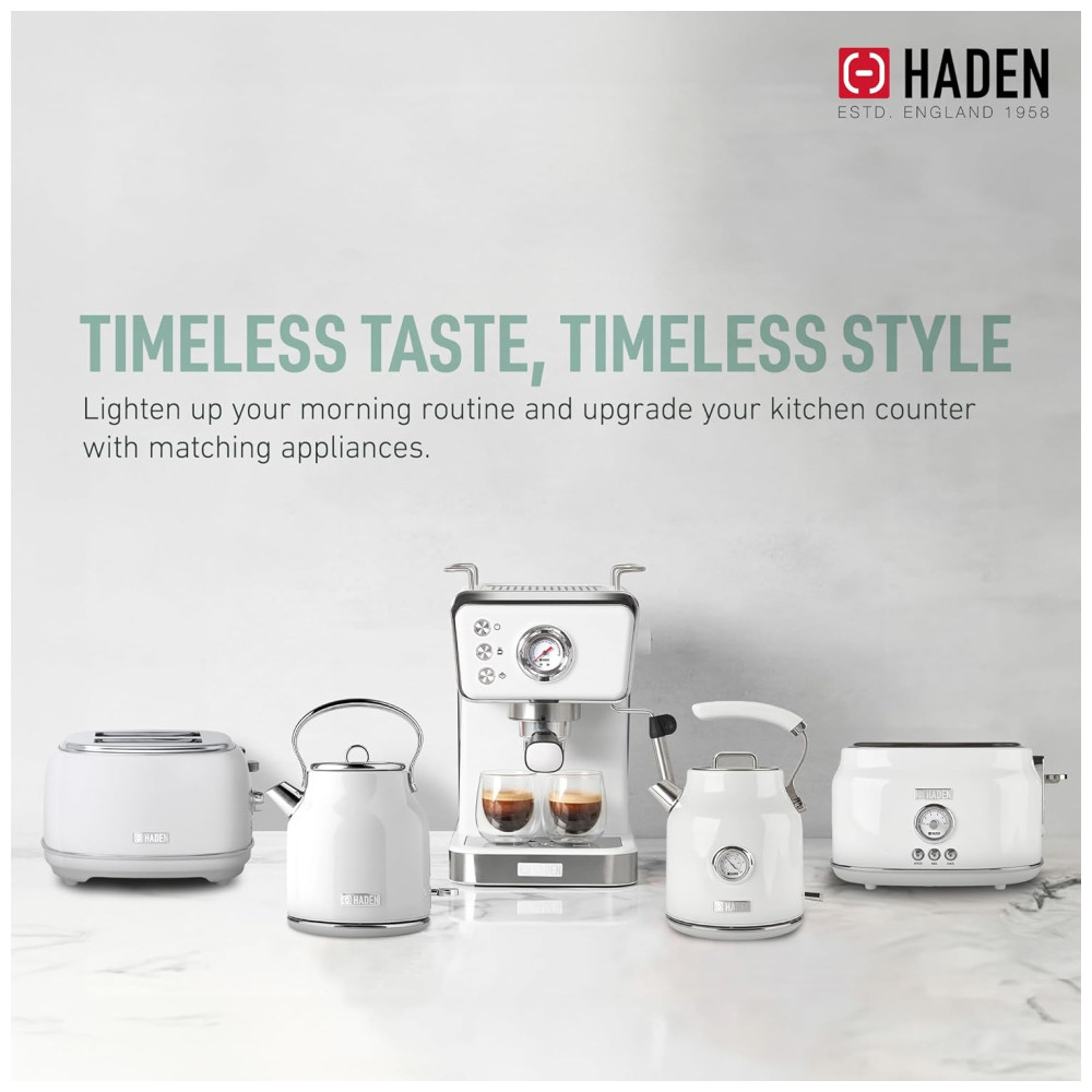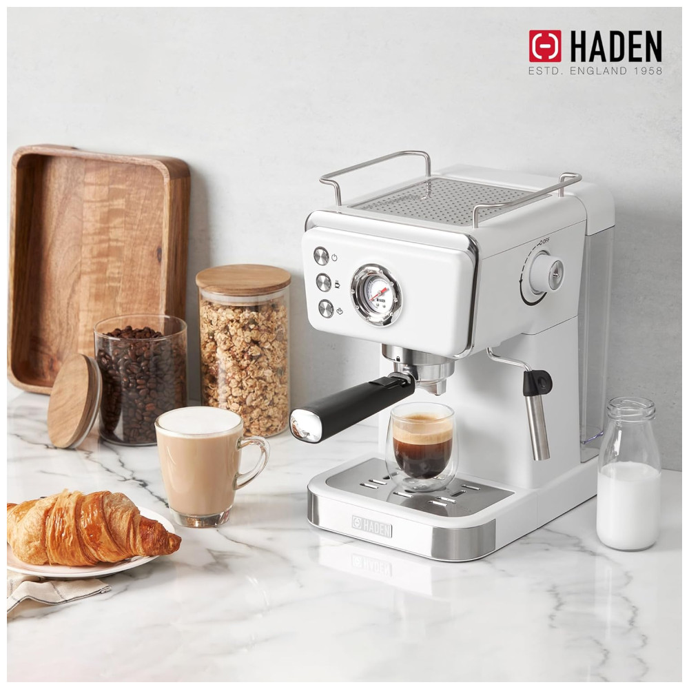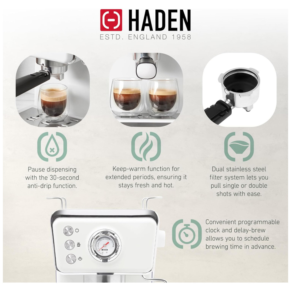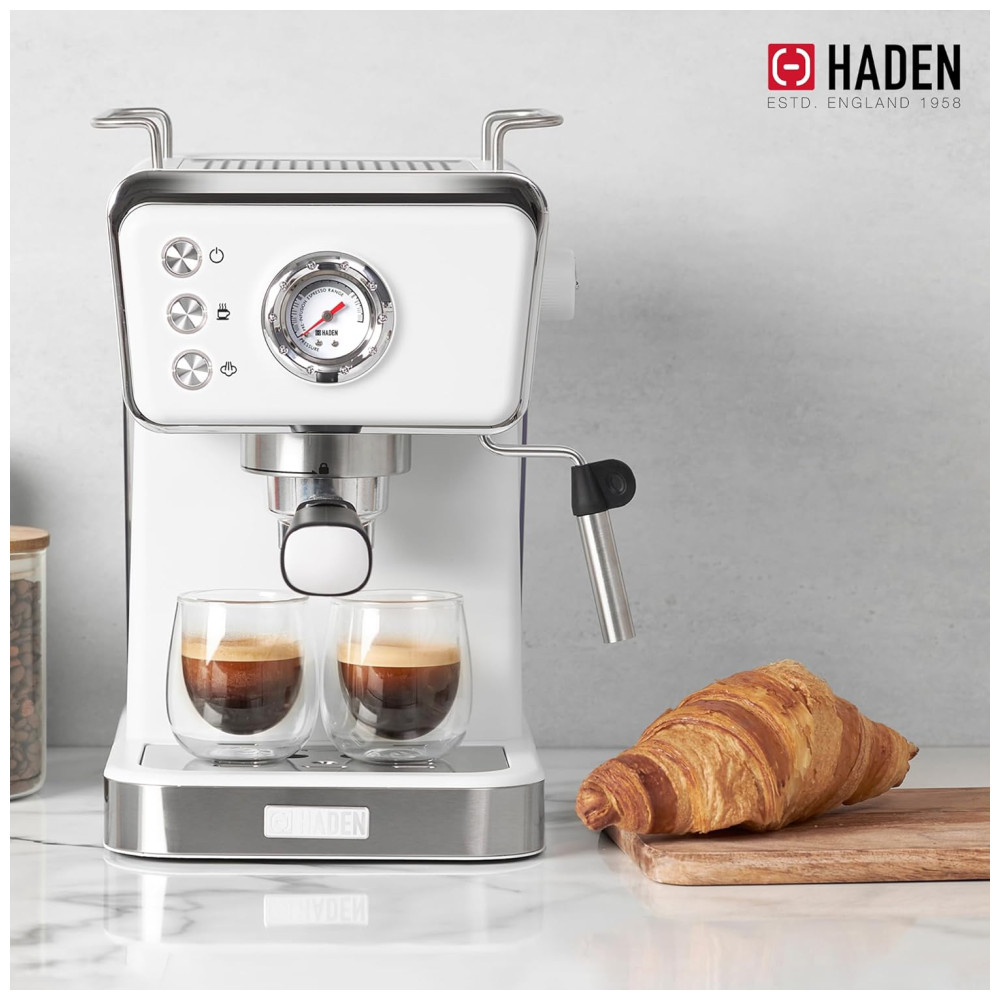 Eleve sua experiência matinal com a cafeteira expresso HADEN, que une estilo clássico e modernidade. Com um design inovador, a máquina mantém as temperaturas ideais para uma extração perfeita, apresentando um poderoso sistema de pressão de 20 bar. O sistema de filtro duplo de aço inoxidável permite doses simples ou duplas, enquanto a função de espuma cria bebidas cremosas. Além disso, como parte da coleção HADEN, a cafeteira apresenta um design clássico com detalhes elegantes e acabamentos modernos, trazendo beleza à sua bancada. A marca Haden é conhecida por oferecer designs britânicos de excelência e tecnologia inovadora em seus eletrodomésticos desde 1958.