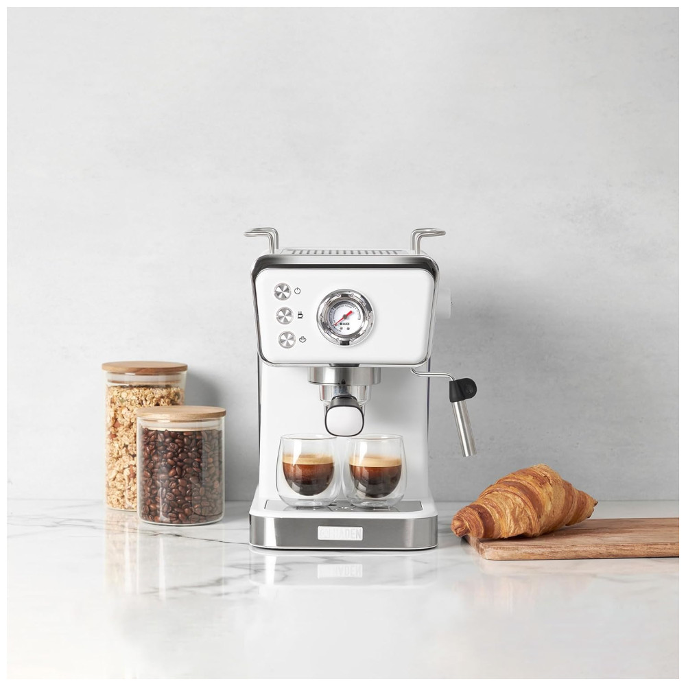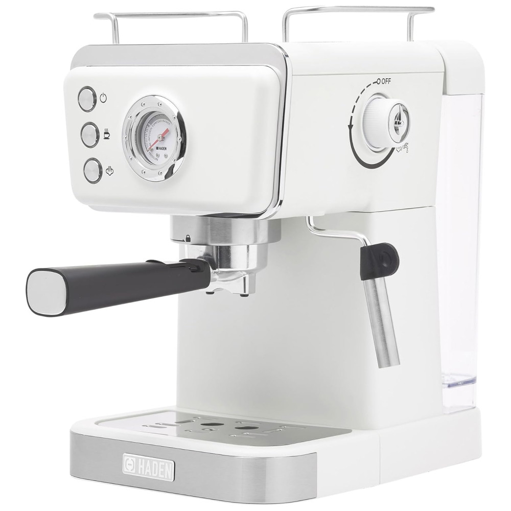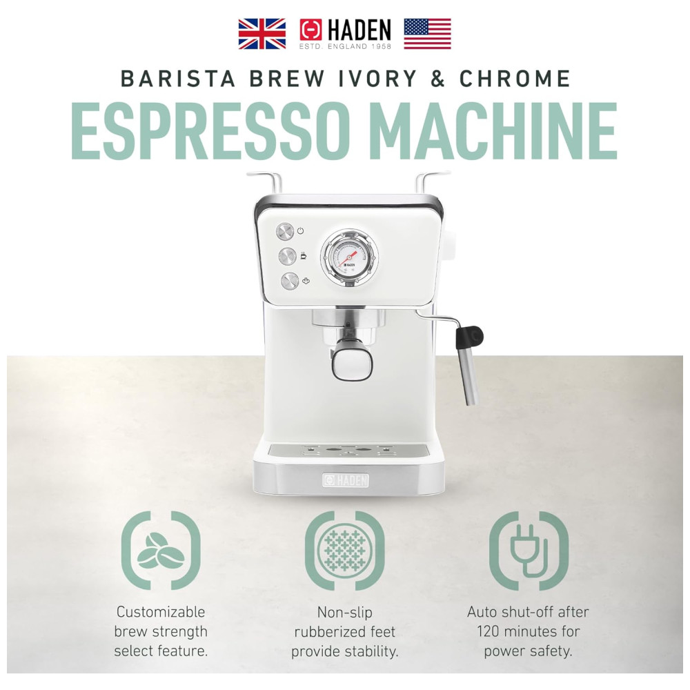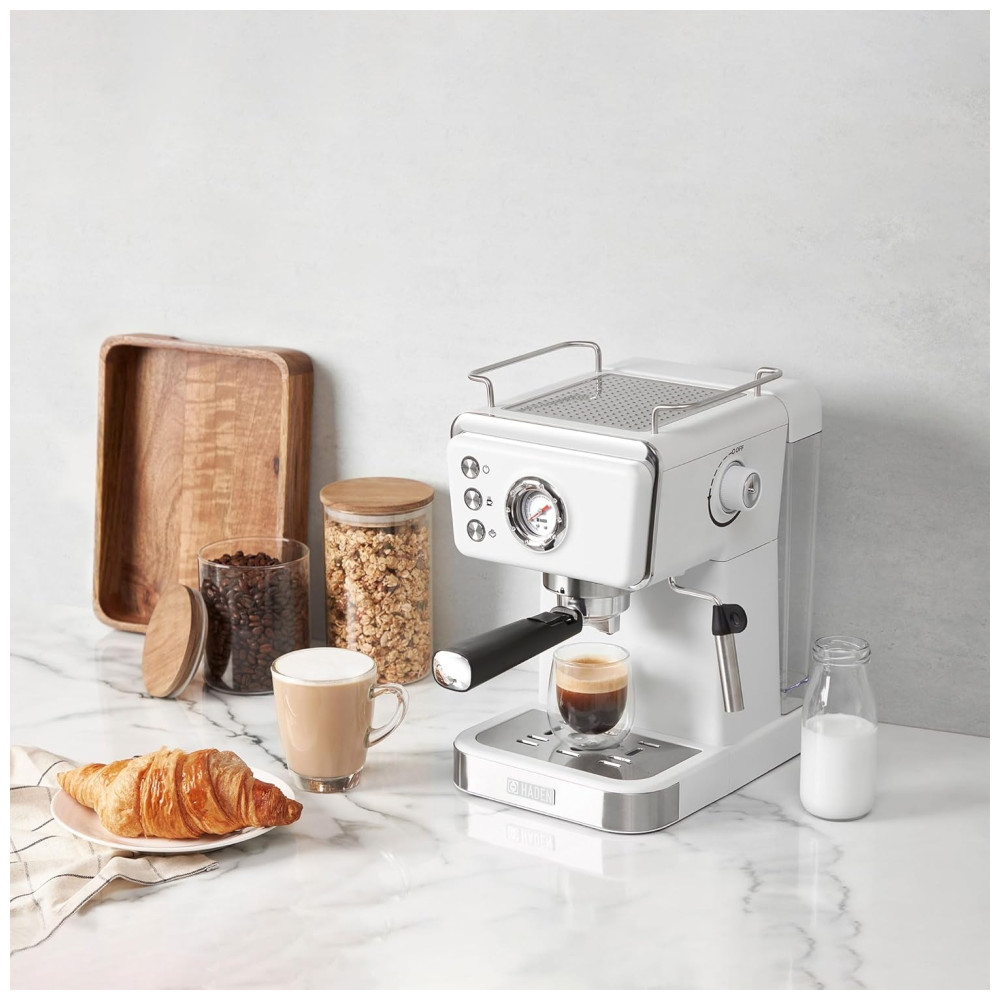 Eleve sua experiência matinal com a cafeteira expresso HADEN, que une estilo clássico e modernidade. Com um design inovador, a máquina mantém as temperaturas ideais para uma extração perfeita, apresentando um poderoso sistema de pressão de 20 bar. O sistema de filtro duplo de aço inoxidável permite doses simples ou duplas, enquanto a função de espuma cria bebidas cremosas. Além disso, como parte da coleção HADEN, a cafeteira apresenta um design clássico com detalhes elegantes e acabamentos modernos, trazendo beleza à sua bancada. A marca Haden é conhecida por oferecer designs britânicos de excelência e tecnologia inovadora em seus eletrodomésticos desde 1958.