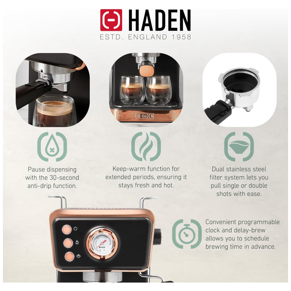 Perfeita para qualquer cafeteria em casa, a cafeteira HADEN tem um sistema de filtro duplo de aço inoxidável que permite que você tire doses simples ou duplas, enquanto a função de espuma cria bebidas cremosas que você vai adorar. Além disso, como parte da coleção HADEN, esta pequena cafeteira apresenta um design clássico, detalhes elegantes, acabamentos modernos e um tom sofisticado que traz beleza à sua bancada.