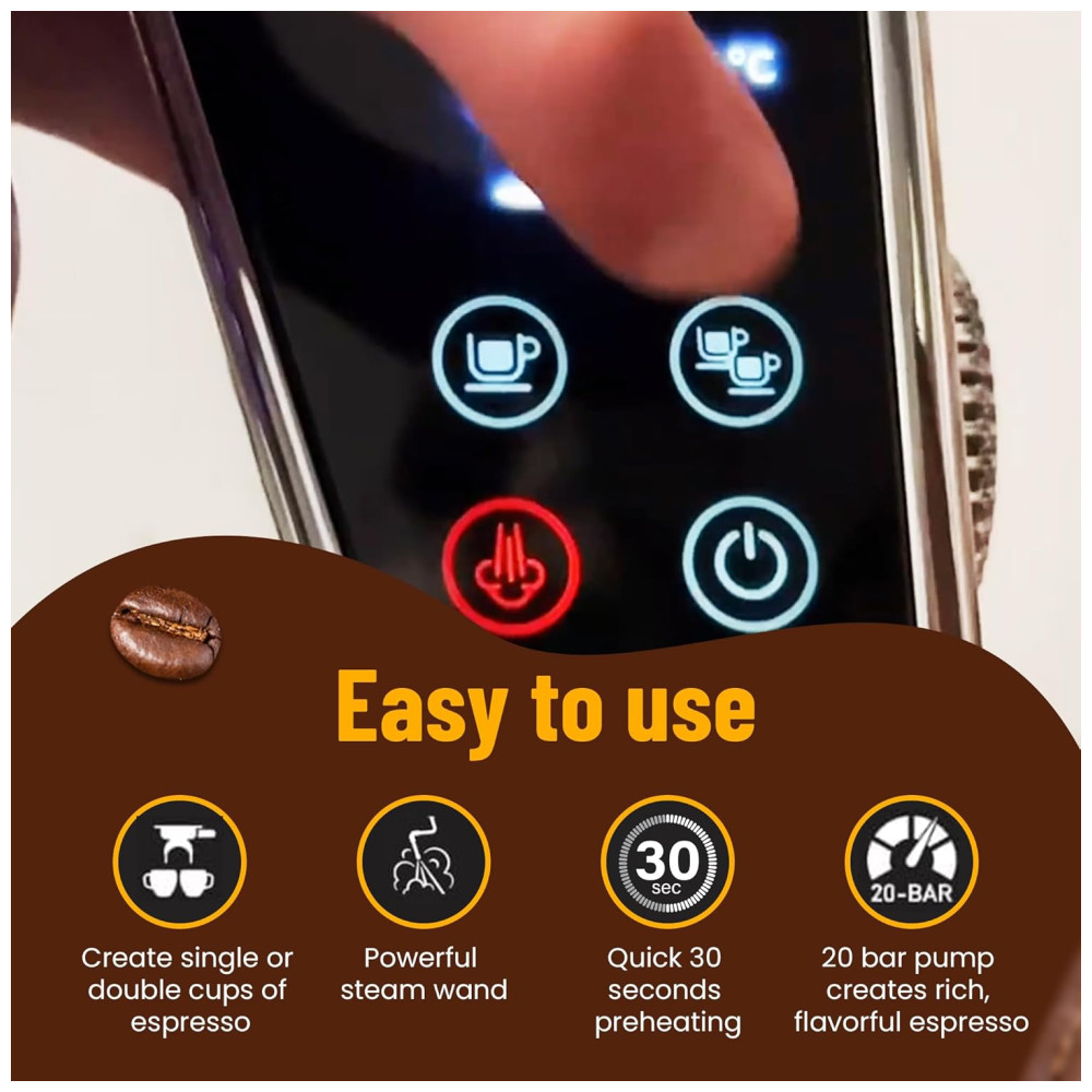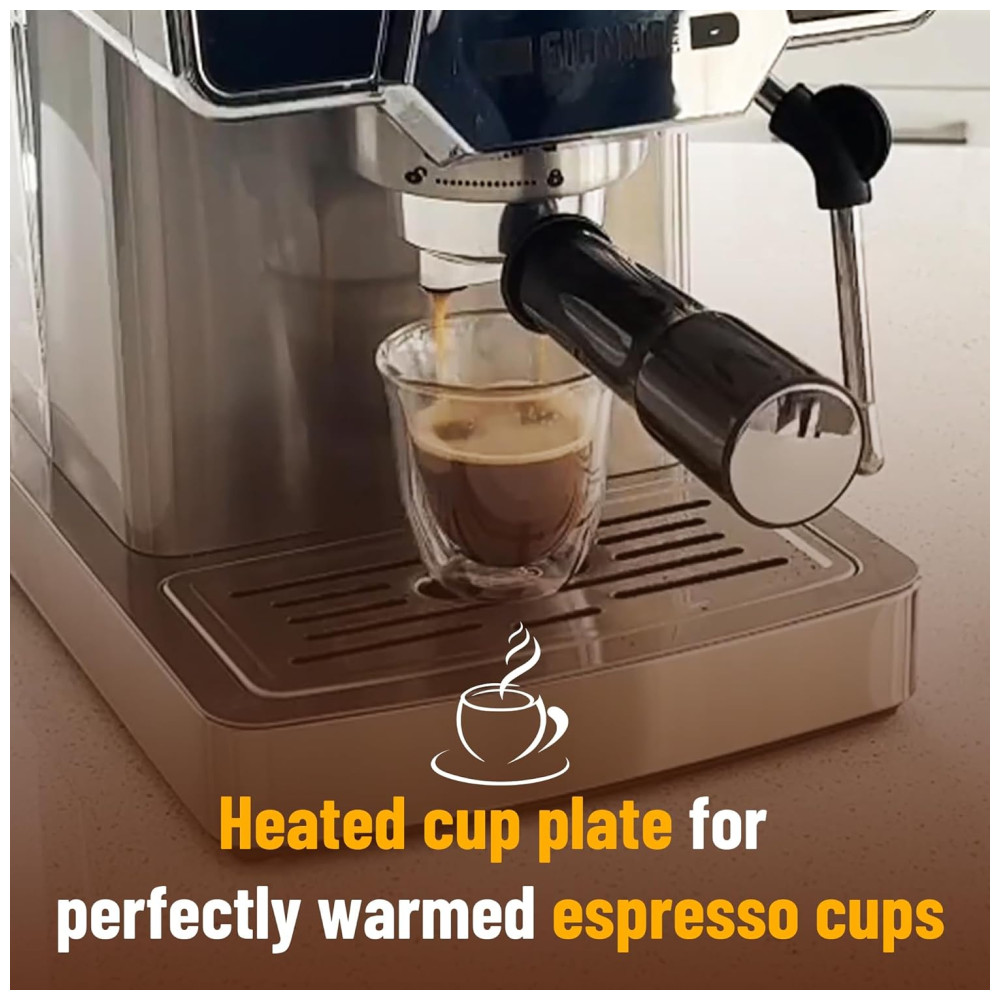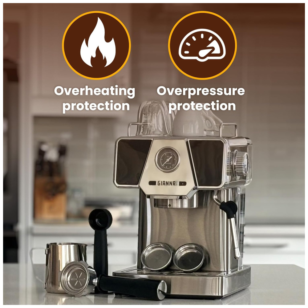 A cafeteira também conta com recursos de segurança, como proteção contra superaquecimento e sobre pressão, além de um display de pressão para controle preciso da preparação. Com um design compacto e elegante, a máquina de café expresso Gianna Milano é perfeita para espaços pequenos e grandes.