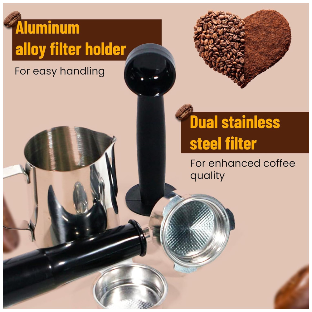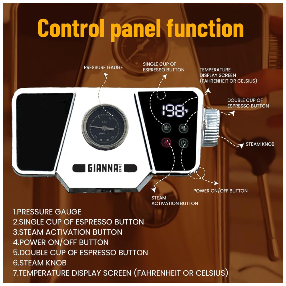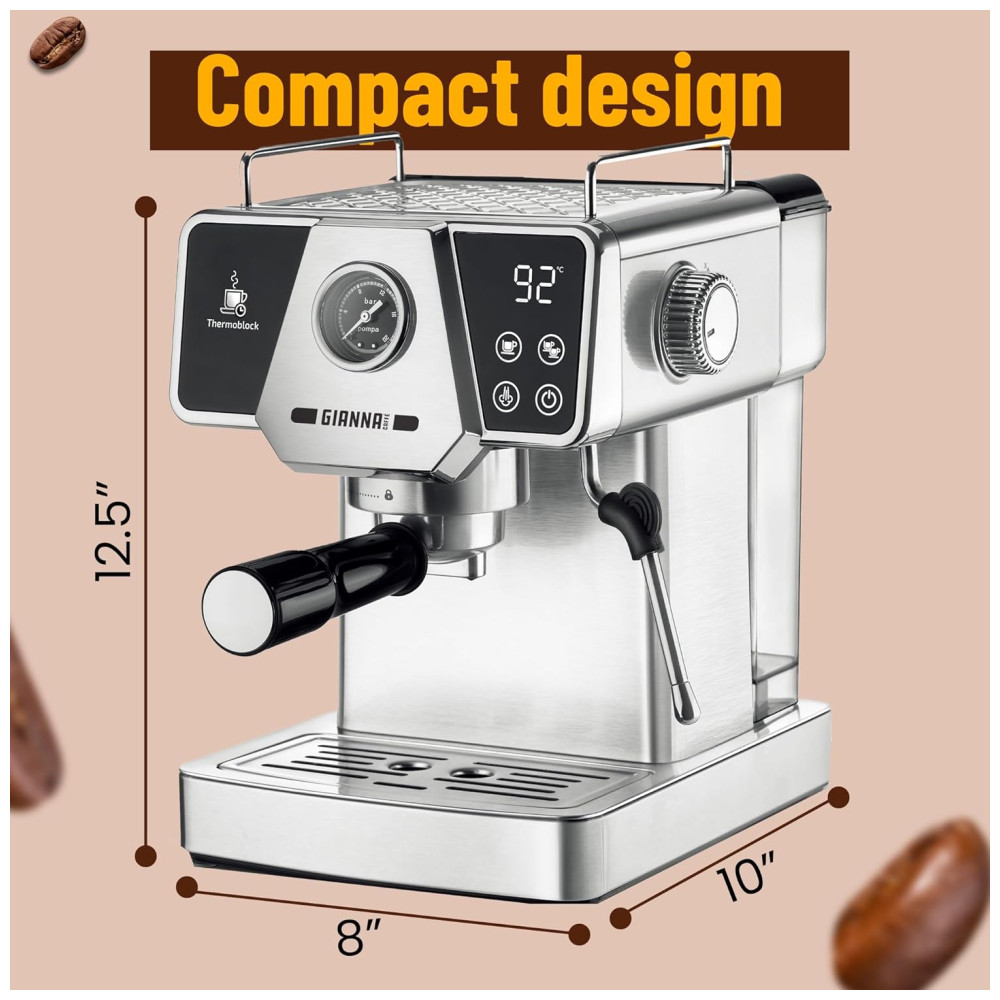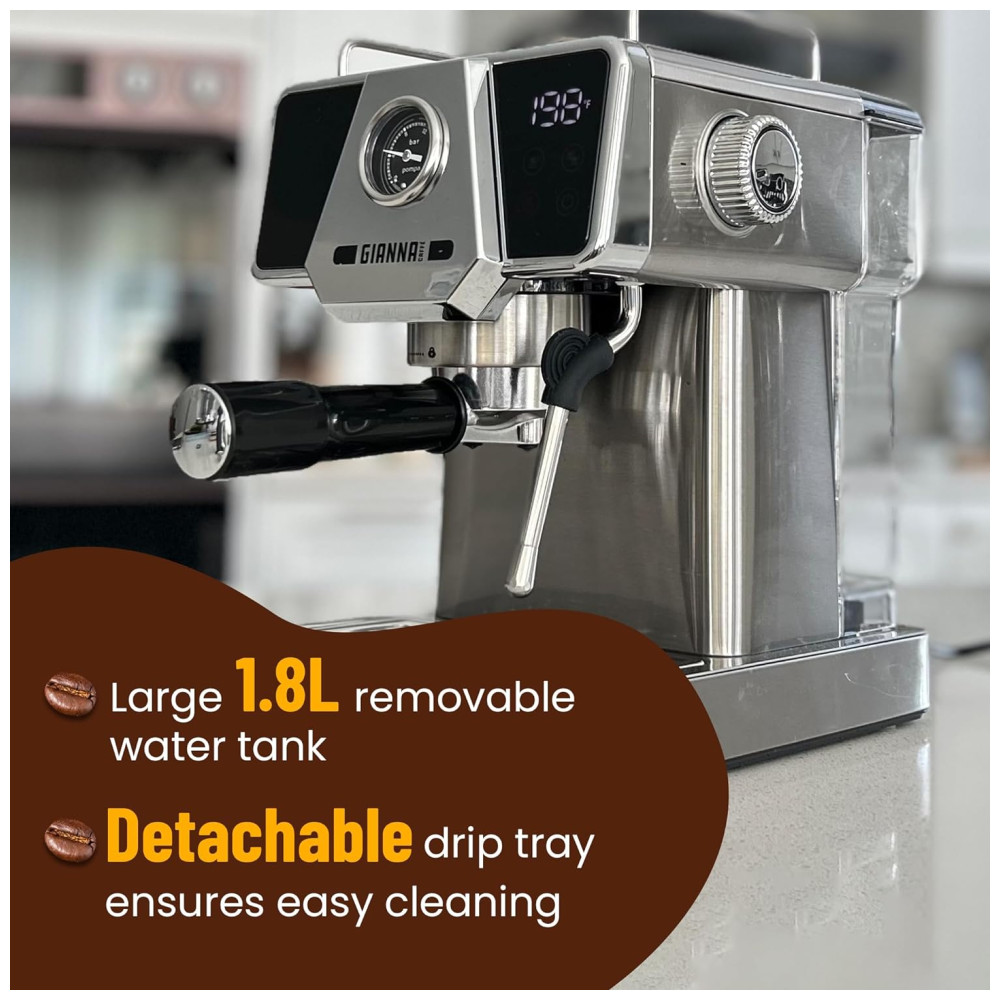 A máquina de café expresso Gianna Milano 20 Bar com bocal de leite é a escolha ideal para os amantes do café que desejam preparar cafés expressos, lattes e cappuccinos de qualidade em casa. Com uma bomba italiana potente de 20 bar, esta cafeteira garante um expresso rico e cremoso. O suporte do filtro em liga de alumínio e os filtros duplos em aço inoxidável garantem a melhor qualidade e sabor do café.